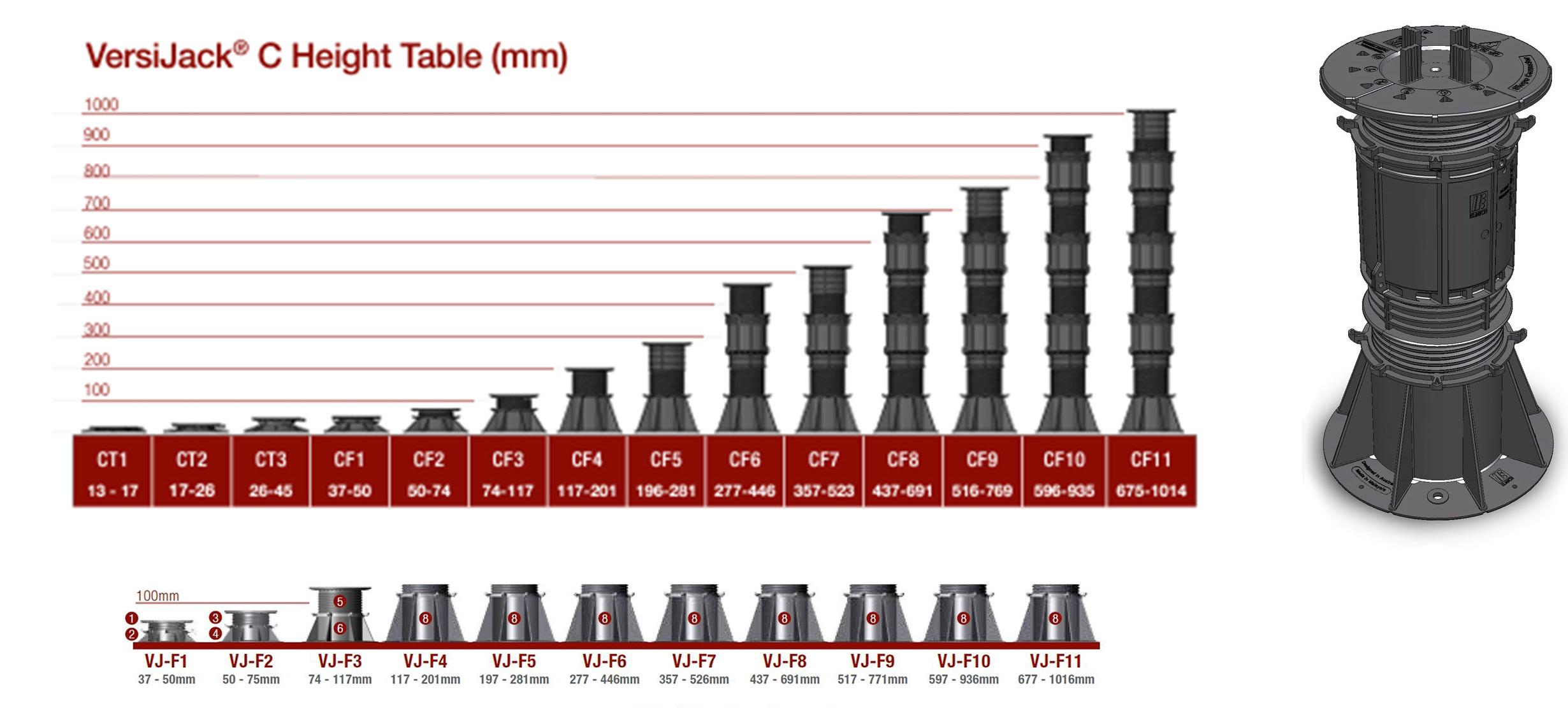 Its caters to a wide range of height requirments, from 13mm - 1014mm, using only three main components parts (Top, Extender and Base).