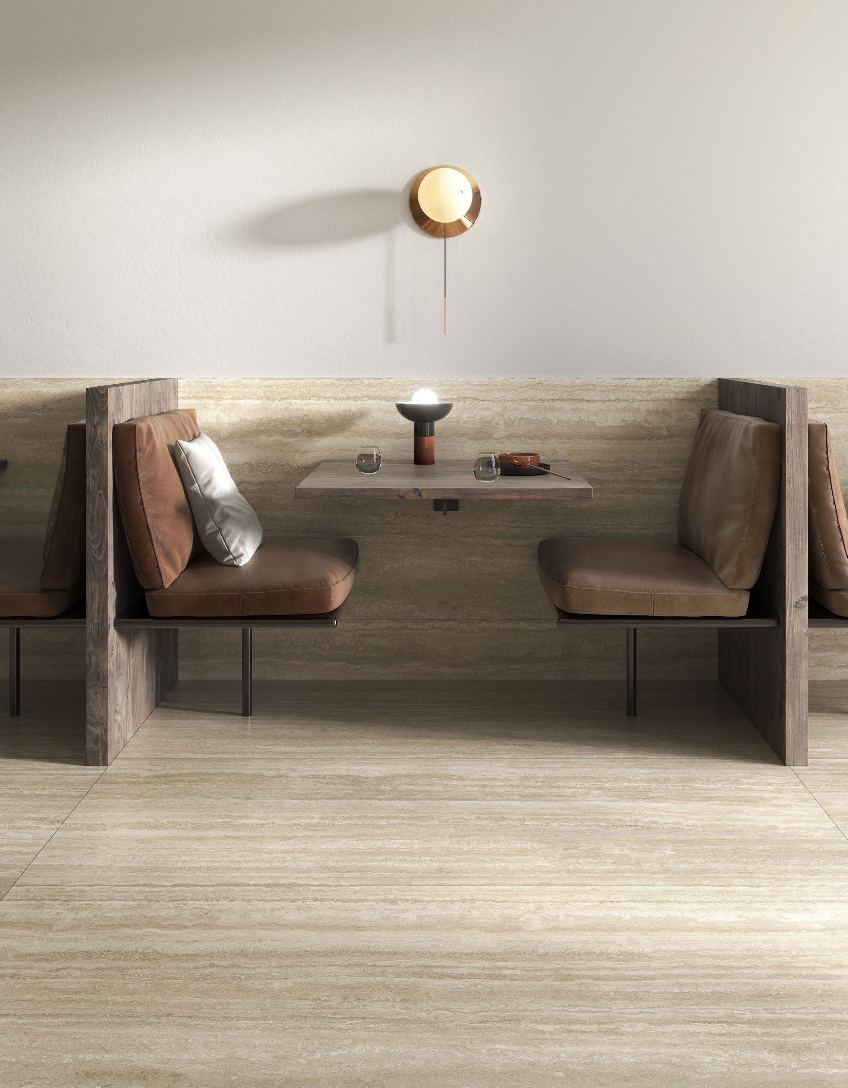 2cm TRAVERTITION porcelain pavers are a lovely soft limestone design available in four colourways with matching interior and outdoor antislip finishes also available. (Refer Page 120)