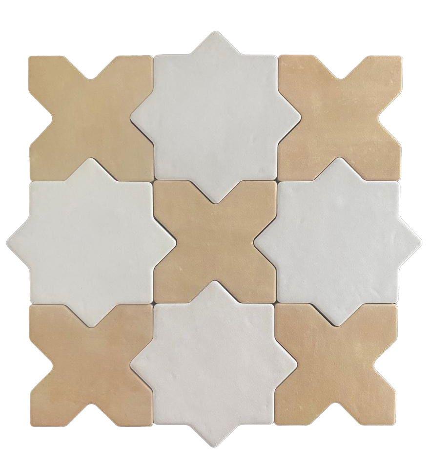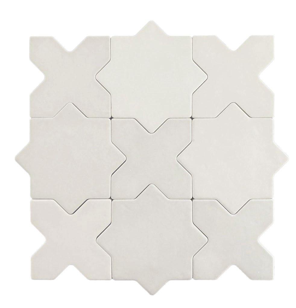 Inspired by the traditional Moroccan star cross design, the new STAR CROSS collection is a glazed porcelain tile suitable for interior floors and walls. Available in two colourways. terracotta and white, the star and cross tiles are sold separately allowing creative combinations to be customised by clients.