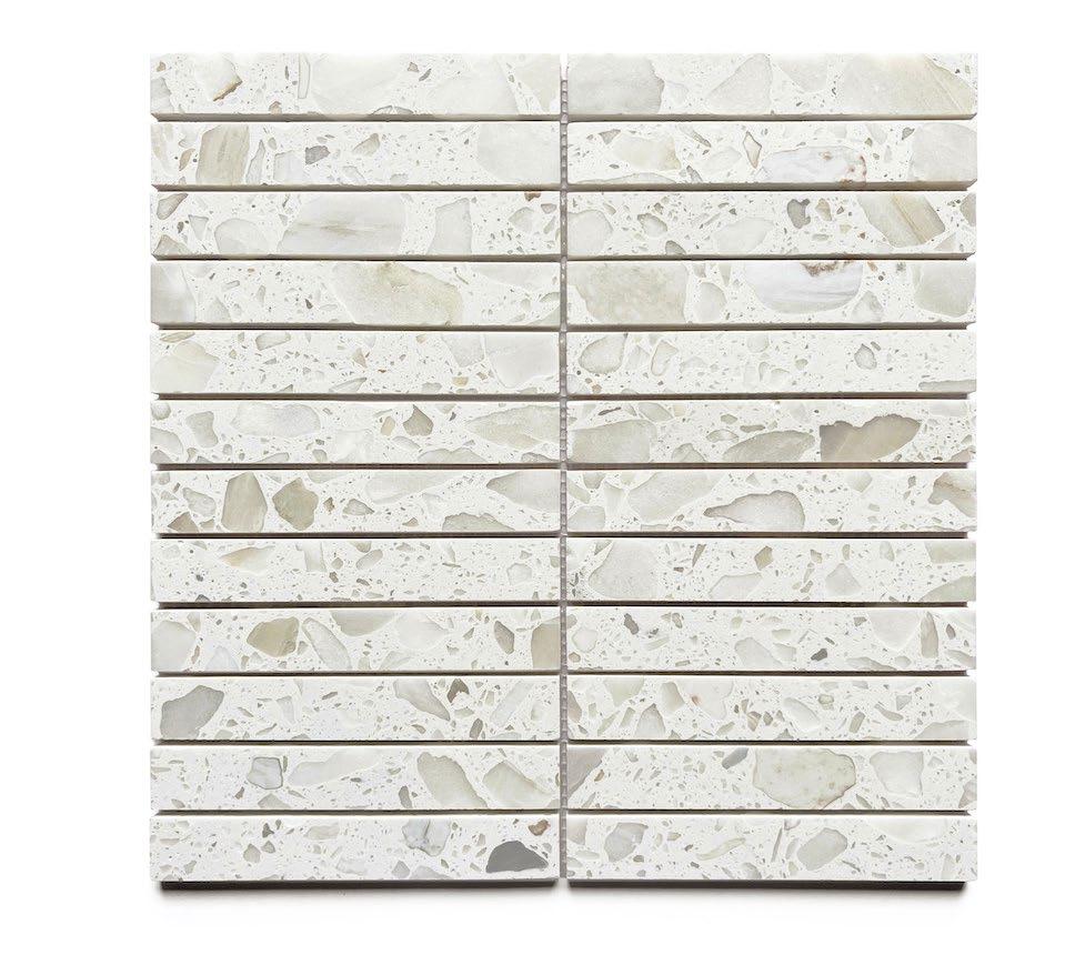 Pictured: Terrazzo Light Grey and Victoria White Gloss Ripple 65x265mm.