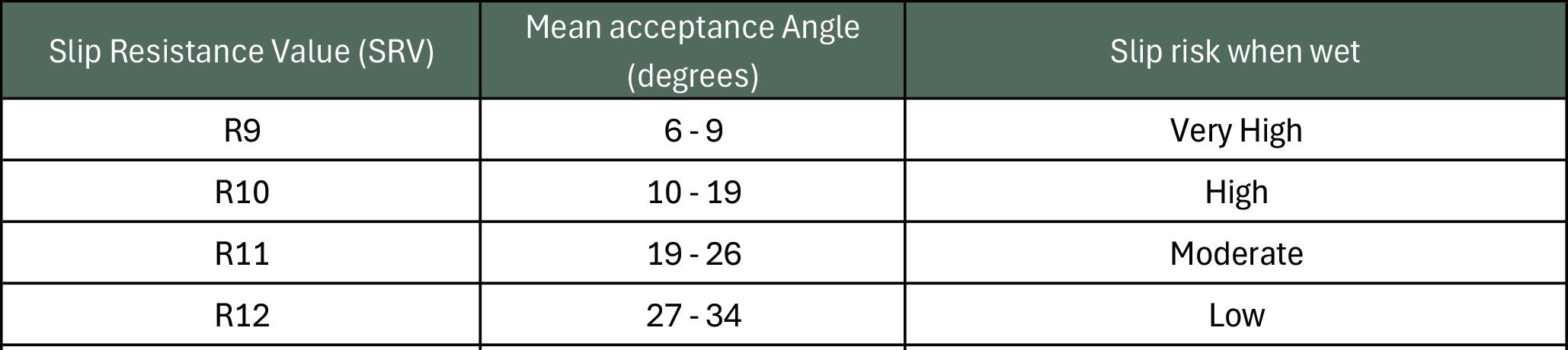 The steeper the angle, the higher the slip resistance, and the higher the score. The tile is awarded an “R – rating” between R9 and R13, with the higher rating indicative of higher resistance. The below table shows the risk profile for each rating. Note that the lowest score possible is R9.