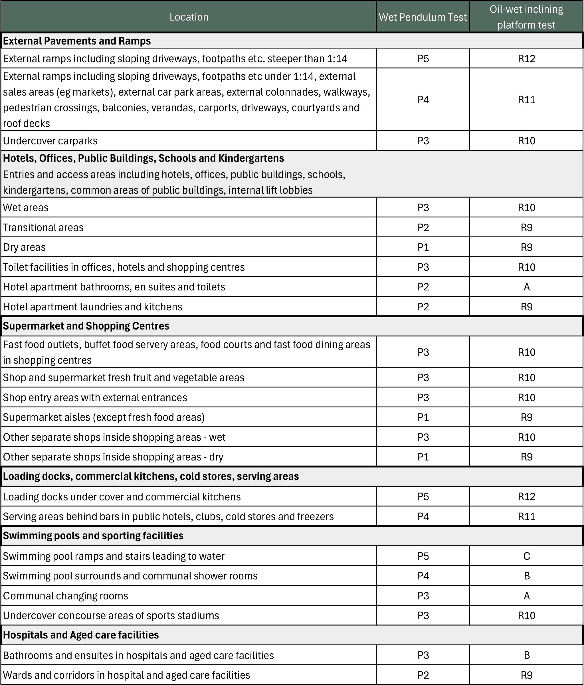 External paths, patios, verandahs: No guidance given but refer to Table 3B from HB 198 (shown on page 6) which recommends a minimum P4 or R11 for areas with less than 1:14 slope.