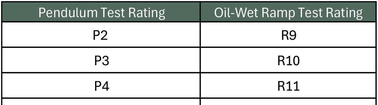 * ABC ratings are a barefoot ramp test not always available from suppliers, pendulum to be used where not available.