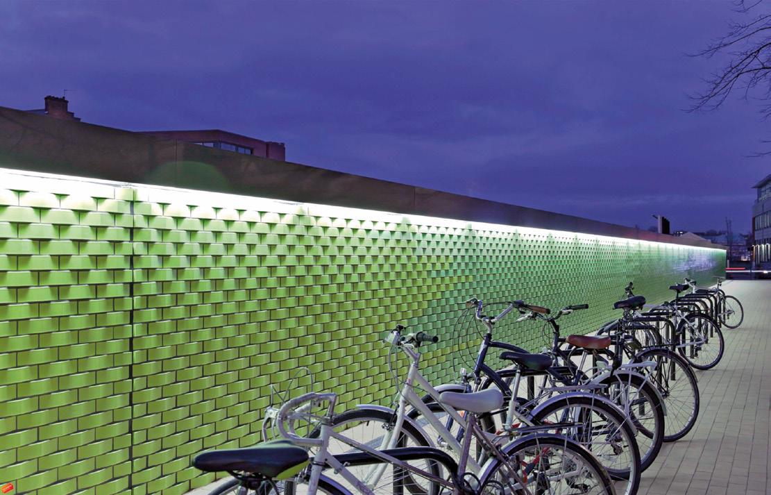 The building also meets ambitious technological goals, including the maximum use of natural light and passive ventilation strategies so as to reduce dependence on artificial lighting and avoid the need for air conditioning systems. A regular grid of brick chimneys supports the floors and book stacks and carries warm air up to ventilate the building. Between each set of four chimneys, there is a roof lantern bringing light down into the spaces below: air rising and light falling. Load-bearing brick and timber were the materials of choice for the new library, which consists externally of a series of three-storey square modules. The architecture firm worked closely with British brickmaker York Handmade to reproduce a variety of bricks in colours ranging from black to pink that