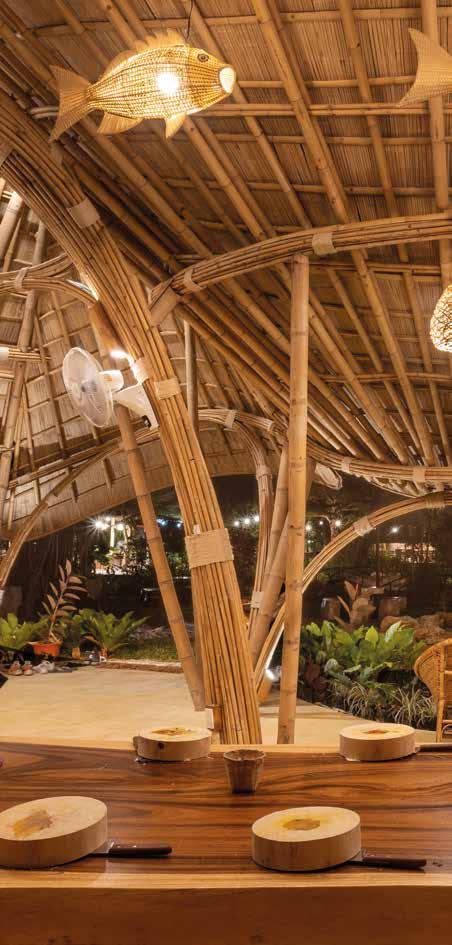 Ma è nella forma che l’architettura raggiunge la sua massima espressività: lasciando fluire le linee naturali del bambù, il progetto ha assunto la sagoma stilizzata di una testa di toro con corna rivolte verso l’alto. Queste diventano ingressi accoglienti, che introducono due ambienti a cupola collegati da uno spazio longitudinale, definendo tre zone distinte per le attività di preparazione, cottura e degustazione.