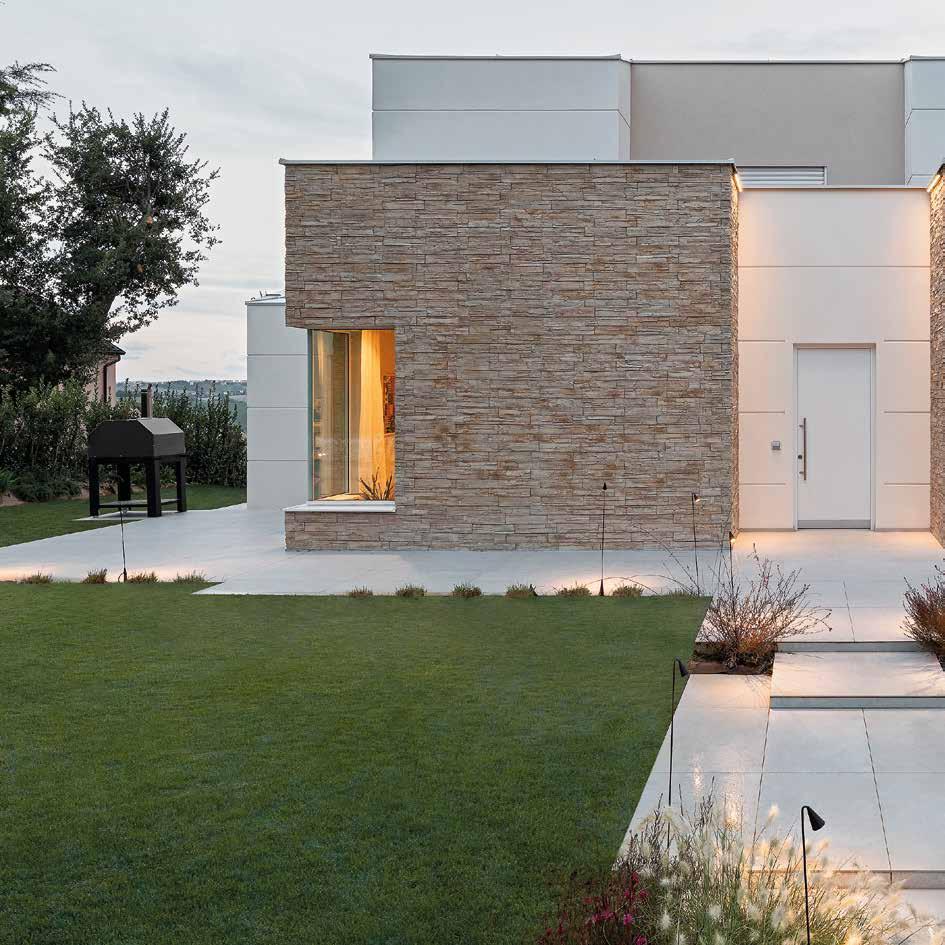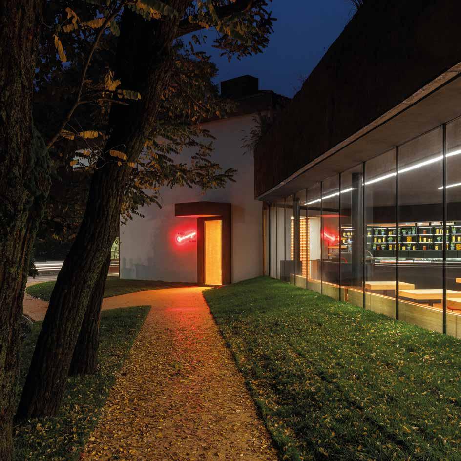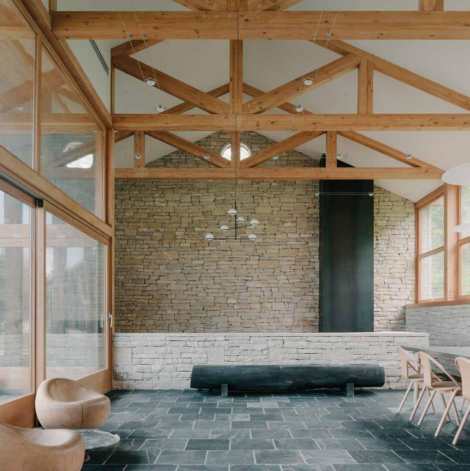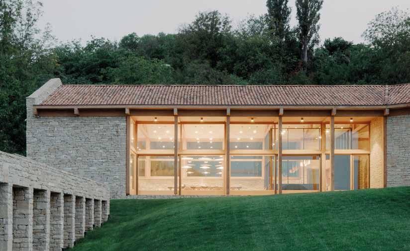 verso l’esterno, creando una continuità visiva e materica con il paesaggio circostante. L’uso diffuso di pietra e legno, dentro e fuori l’edificio, rafforza questa connessione, dando forma a un’architettura silenziosa ma fortemente radicata.