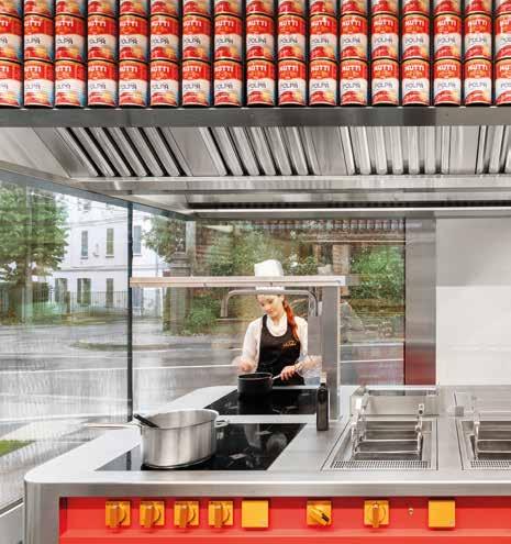 piatti, dieci per la cottura e un ampio tavolo conviviale. Per ottimizzare lo spazio ridotto, i progettisti hanno adottato una pianta a U che amplia l’area coperta e consente una visuale aperta sia sul fronte dell’edificio, visibile da ogni angolo della proprietà, sia sul retro, che si affaccia sulle risaie.