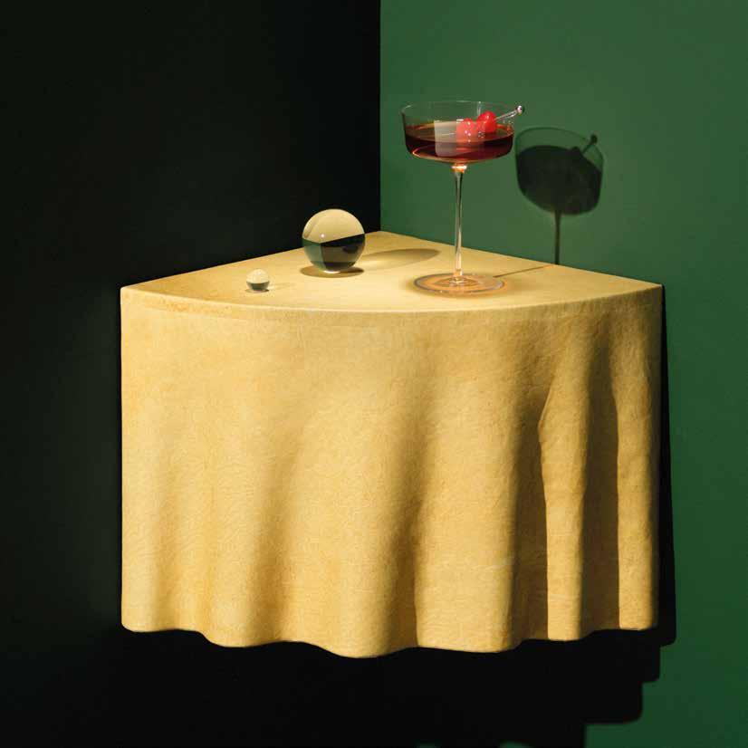 La collezione di arredi ideata da Studio TOOJ come esplorazione surrealista della percezione e della materialità si caratterizza per l’anima innovativa e sostenibile data dal rivestimento in Reishi™, il biomateriale ricavato dal micelio proposto da MycoWorks. Spicca per personalità il tavolo angolare a parete DUK, pensato per sfidare il confine tra illusione e realtà: a prima vista sembra un semplice elemento drappeggiato in un angolo, ma ad una osservazione più attenta si rivela vero e proprio piano d’appoggio a metà tra arte e funzionalità. La texture organica del materiale e le sue sottili variazioni esaltano la forma scultorea del tavolo conferendogli inoltre un carattere ecologico. Reishi™ rappresenta infatti una nuova categoria di materiali: naturale, privo di plastica e di origine non animale, disponibile su scala industriale.