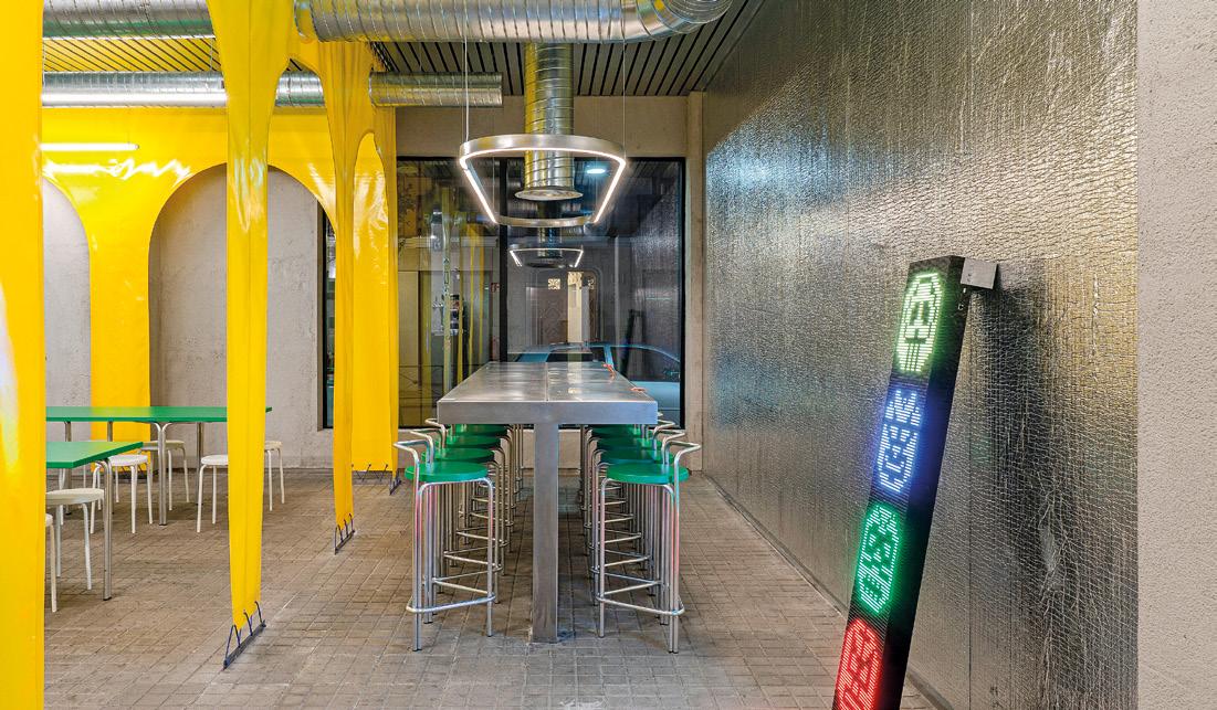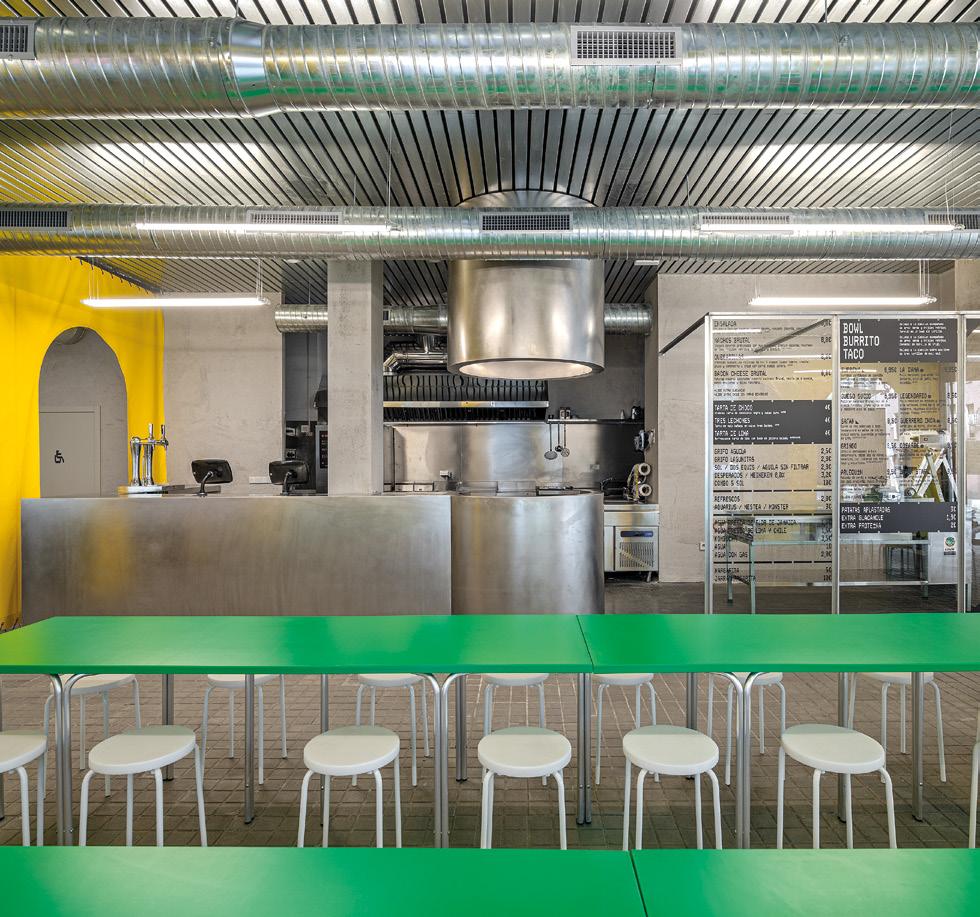 The kitchen area has a functional and technical appearance, thanks to extensive use of stainless steel as a hygienic surface on which to prepare and serve food. Steel is also used for the ceiling covering, which extends beyond the perimeter of the cooking area and imbues the entire space with its metallic reflectivity. The highlight of the kitchen area is undoubtedly the comal, an adaptation of the traditional pre-Columbian utensil used mainly in Mexico for cooking tortillas, which takes on a central position here, both physically and symbolically, by playing a key role in all the cooking operations carried out at Brutal Burrito. It is a polished stainless steel cylinder divided into two halves, a grille and an extractor hood, connected by nothing more than smoke and flames. Another hallmark of the environment is the tortilladora, an appliance specifically designed for making tortil-