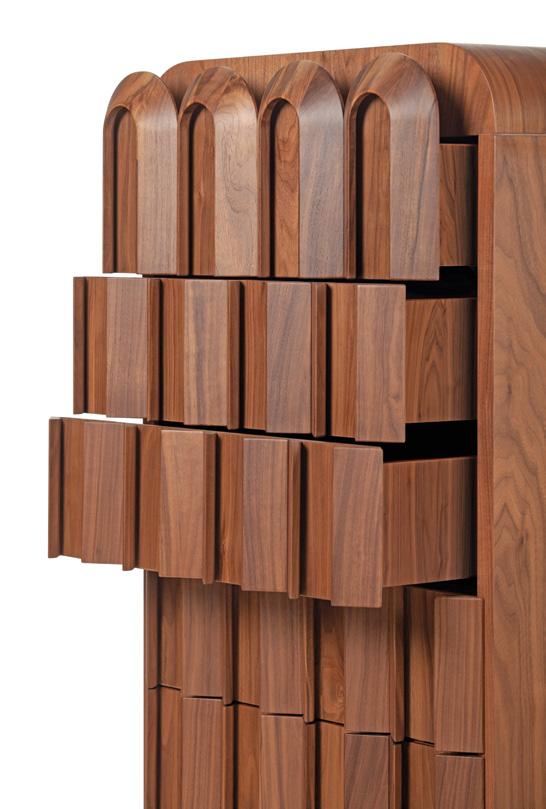 Like the eponymous family of furniture to which it belongs, the Arcate semainier, or seven-drawer dresser, by Medulum – designed by the Accardi Buccheri firm of architects and designers, who are also the company’s artistic directors – draws inspiration from the brand’s Venetian origins. In fact, Arcate pays homage to the arch – one of the key elements of architecture – in the form typically found in the Romanesque buildings on some of the smaller islands of the Venice lagoon. Arcate also showcases a unique geometry, defined by the rhythmic succession of arches made of solid American black walnut. Expertly milled to the highest standards of craftsmanship, these elements create a system of grooves and handles that give the front of the dresser a unique appearance, while remaining apparently invisible. The distinctly original design of the handles emphasises the sculptural nature and exceptional personality of the dresser, while also underscoring the practicality of the large drawers it contains.
