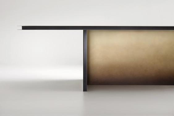 Equidistant sheets of metal punctuate the shape of Folio, giving rise to an interesting interplay of shadows, in contrast to the light reflected upon the horizontal plane.