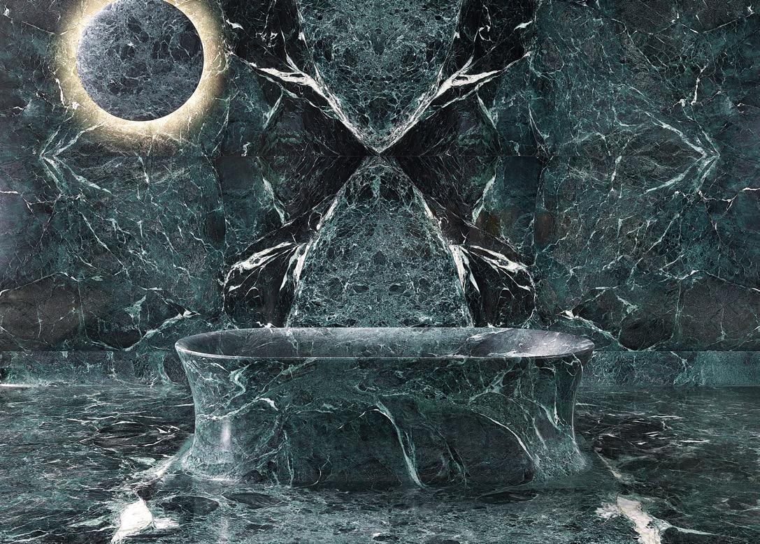 Meti, designed by STUDIOPIVA, is inspired by the figure of Methis, the Greek goddess symbolizing transformation and wisdom. The monolithic disc that forms the lamp, crafted from Verde Alpi marble, appears as a suspended presence between light and material.