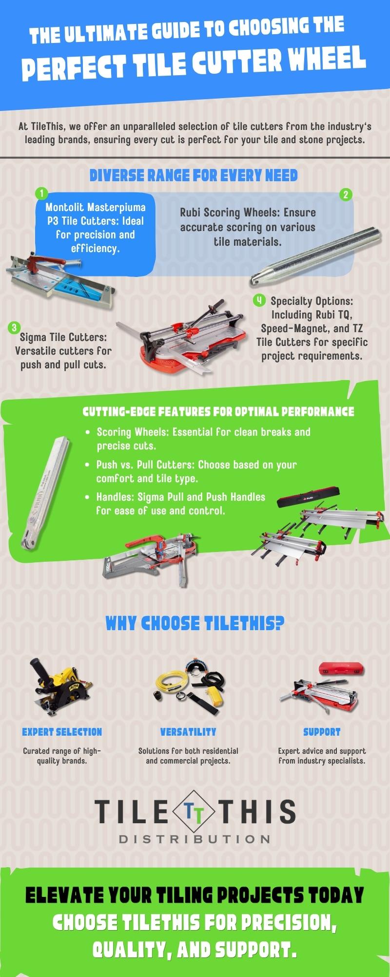 https://tilethis.com/product-category/tile-cutters/: TileThis stands as your ultimate partner for achieving perfection in tile and stone projects, offering an unmatched selection of high-quality tile cutters from the industry’s leading brands. Our diverse range caters to every need, featuring the precision of Montolit Masterpiuma P3 Tile Cutters, the accuracy of Rubi Scoring Wheels, the versatility of Sigma Tile Cutters, and specialized options for unique project requirements. With cutting-edge features designed for optimal performance, TileThis not only ensures flawless cuts but also provides expert advice and support to elevate your tiling projects. Whether you're embarking on a residential makeover or a commercial build, choose TileThis for precision, quality, and unparalleled support in every cut.