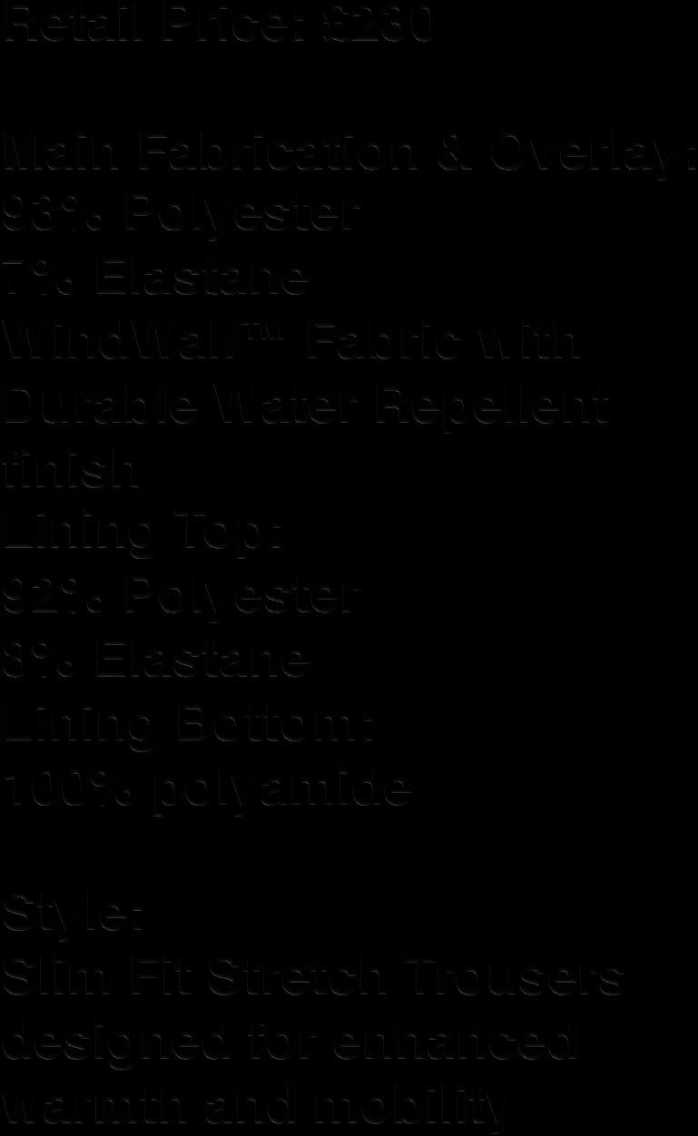 - Current range features GORE-TEX (Expanded polyethene membrane technology) which is durably waterproof, breathable and windproof.