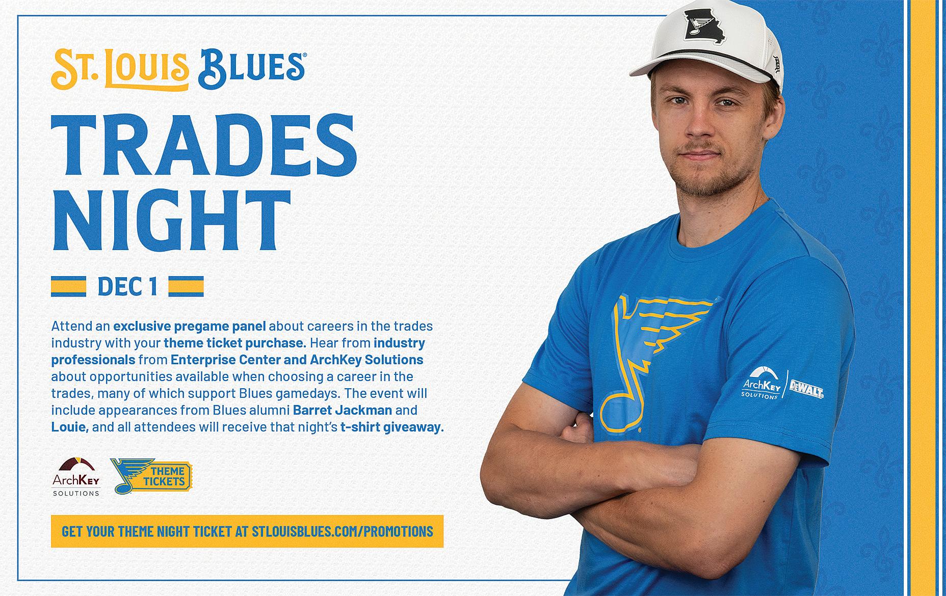 Dec. 1 – St. Louis Blues Trades Night – Watch the St. Louis Blues take on the Anaheim Ducks at the Enterprise Center and attend an exclusive pregame panel about careers in the trades industry with your theme ticket purchase. Hear from industry professionals from Enterprise Center and ArchKey Solutions about opportunities available when choosing a career in the trades. The event will include appearances by Blues alumni Barret Jackman and Louie, and all attendees will receive that night’s t-shirt. To purchase tickets, visit stlouisblues. com/promotions
