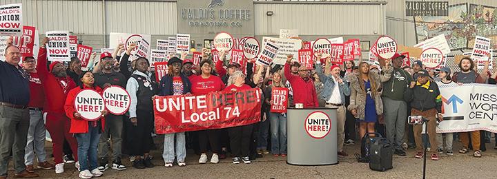 St. Louis – Kaldi’s workers citing poor work conditions and low pay rallied Nov. 5 outside the coffee company’s headquarters on Gratiot Street to announce their organizing effort with UNITE HERE Local 74 and demand the company recognize their union.