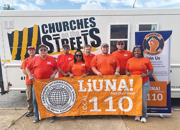 ST. LOUIS – The Laborers Local 110 Volunteer Organizing Committee (VOC) teamed up with Churches on the Streets Aug. 25 to pass out food, hygiene products and much more to the unhoused in Downtown St. Louis and North City. Taking part in the one-day effort was (front row from left) Local 110’s Don Kreienheder, Delicia Simpson, Mark Barbay, and BreeAnna McKinney, and (back row from left) Local 110 Auditor Nick Schierhoff, Business Agent Jose Hernandez, Mathew Bilicki and Business Agent/VOC Chairman Colby Erhart. Churches on the Streets is a 501c3 non-profit organization that exists to meet the physical and spiritual needs of the poor. – Laborers Local 110 photo