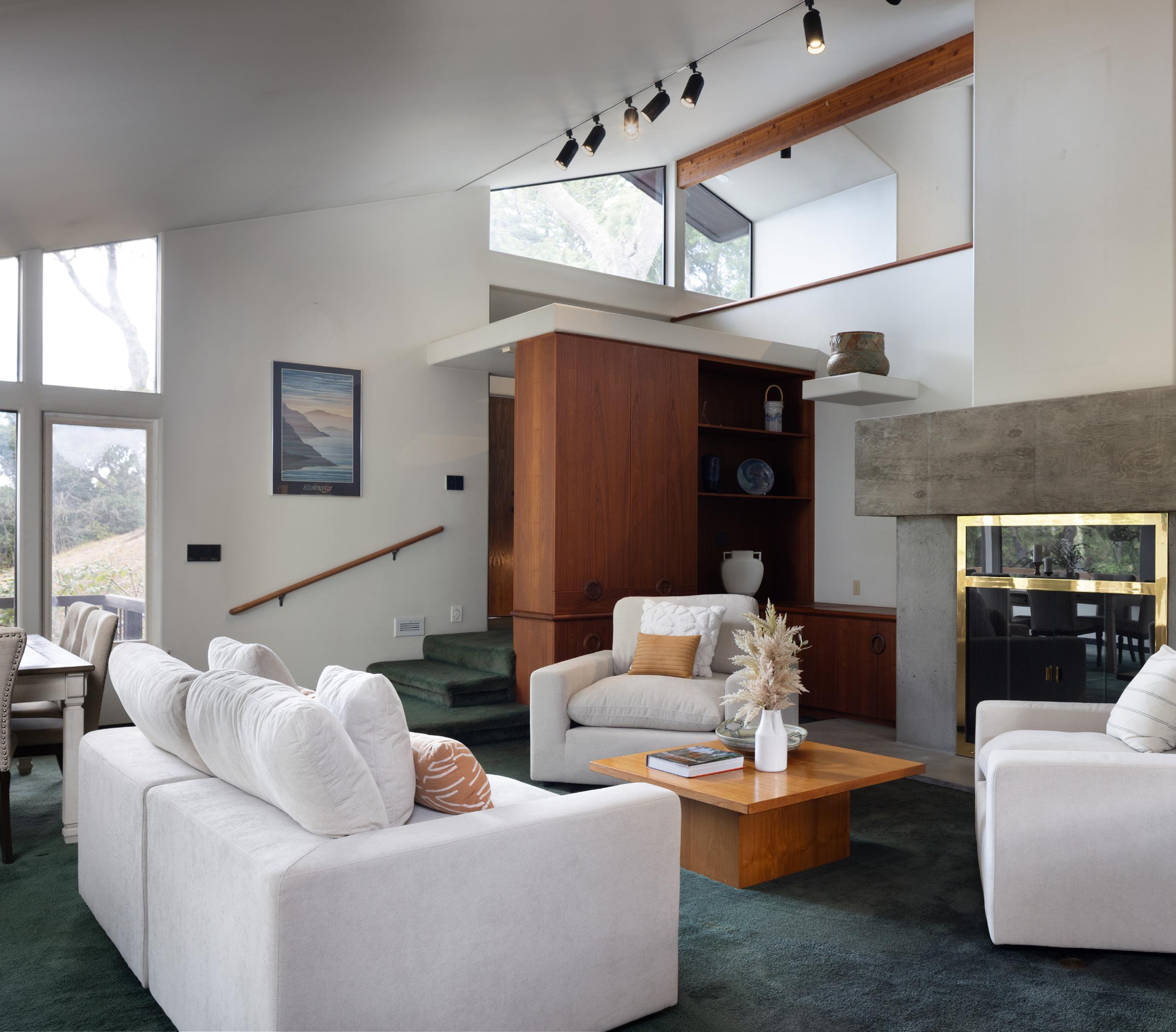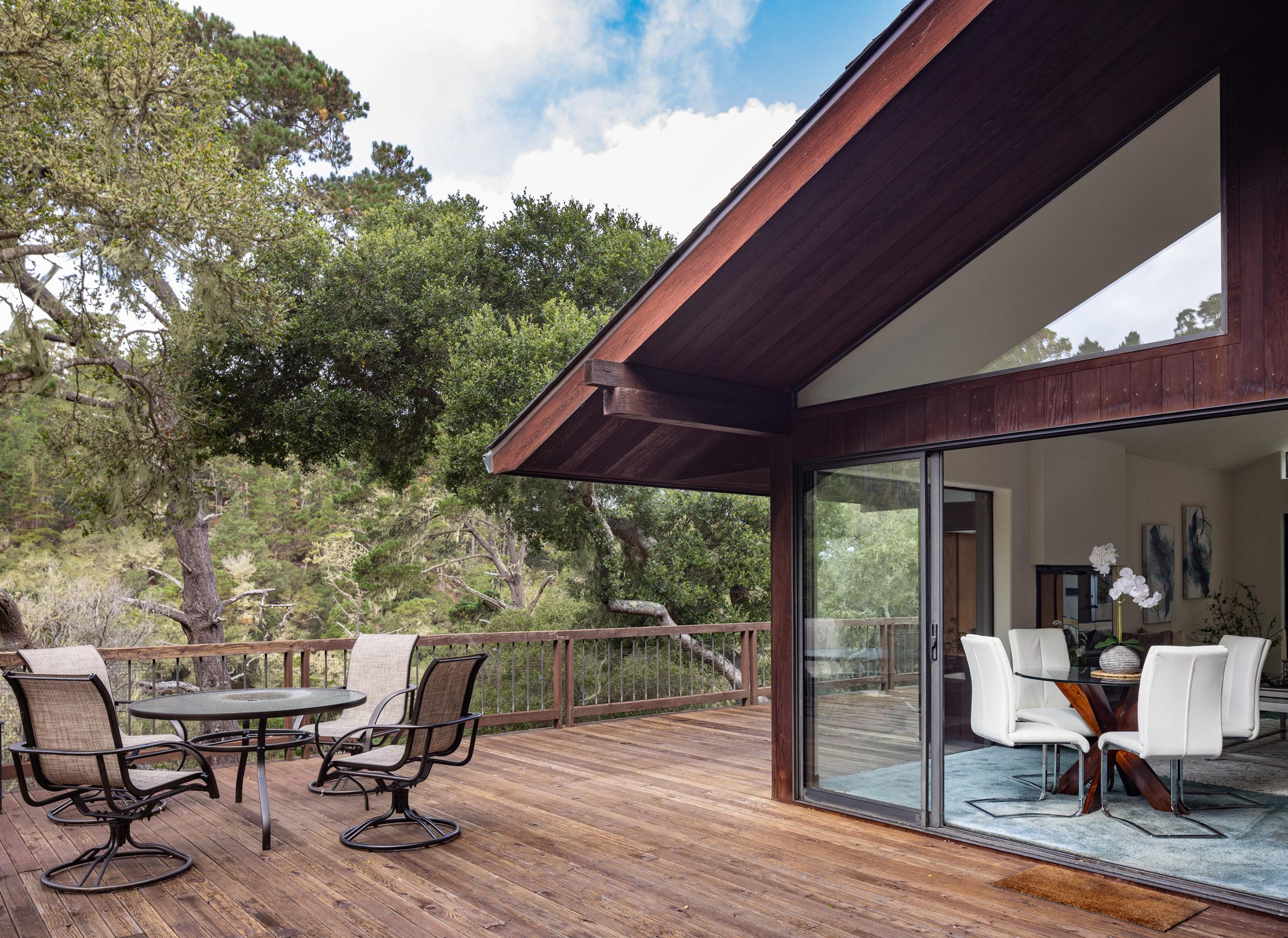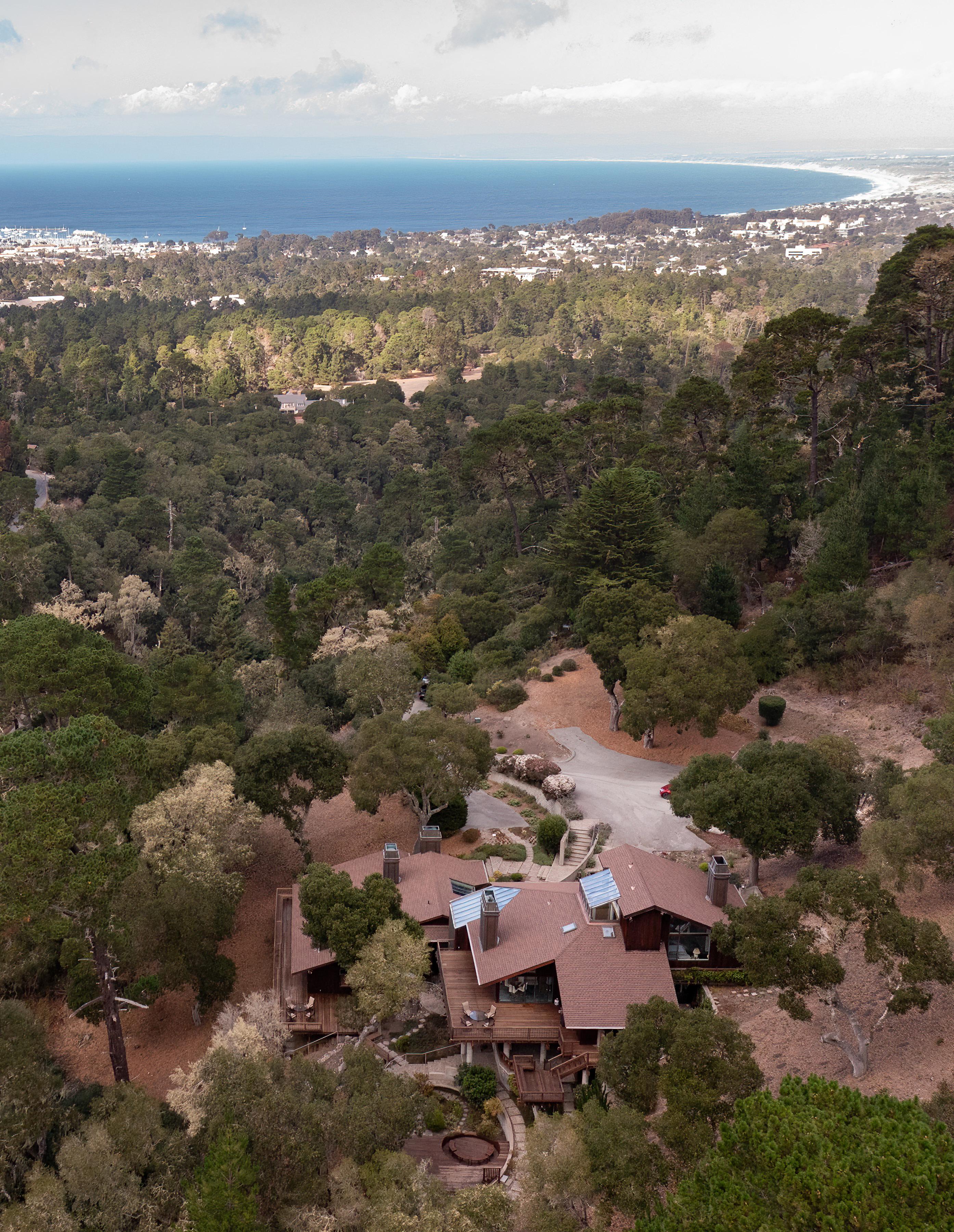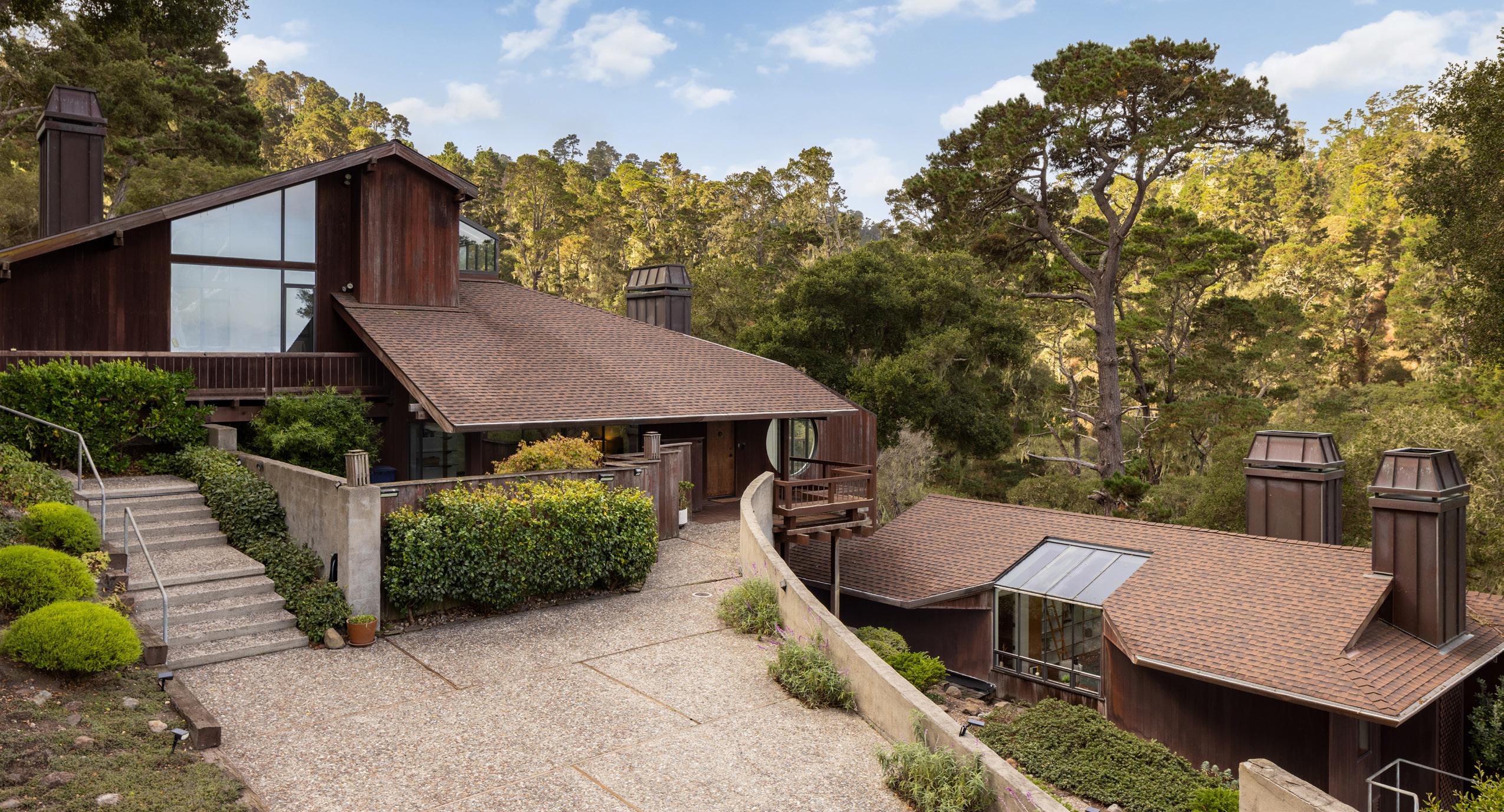 Designed by local acclaimed architect Olof Dahlstrand, this architectural gem blends timeless design with the tranquility of its five-acre Carmel setting. Crafted in redwood and teak, the 5,777± sq. ft. residence frames sweeping views of Monterey Bay and the surrounding forest through walls of glass and expansive decks. Inside, warm textures and fine materials define every space, including five sculptural concrete fireplaces and custom built-ins throughout. Perfect for entertaining, the home features multiple living areas, including a library and family room, and two full kitchens—one with a commercial-grade Vulcan range and dual Traulsen refrigerators. Four ensuite bedrooms each open to private patios, while the primary suite offers its own fireplace and kitchenette. Additional amenities include a sauna, two laundry rooms, an artist studio with water, and a detached four-car garage. Centrally located within a few minutes’ drive into downtown Carmel, Monterey, and all the incredible amenities the Peninsula has to offer, this rare architectural retreat is a place where design, nature, and light exist in perfect harmony.