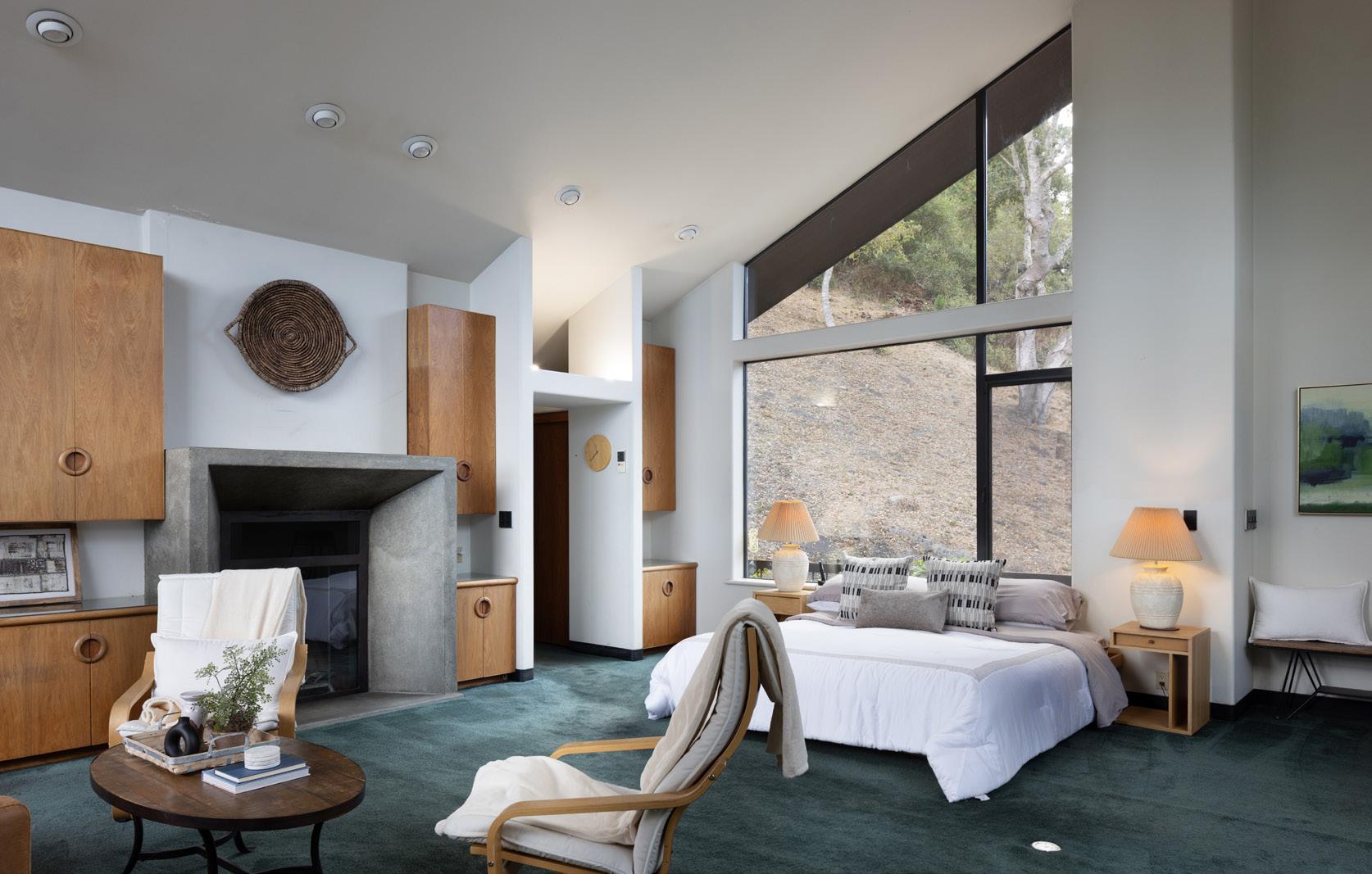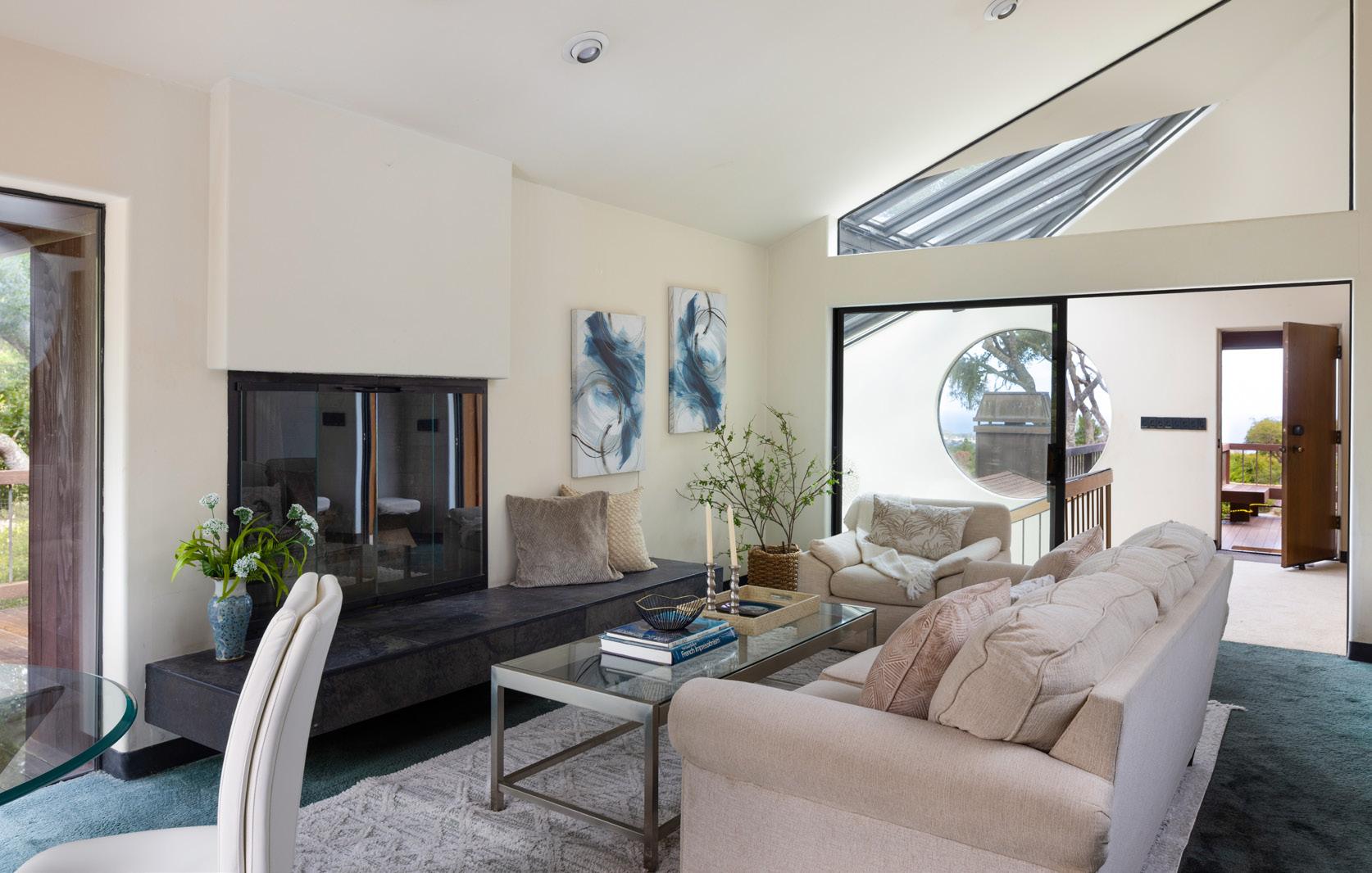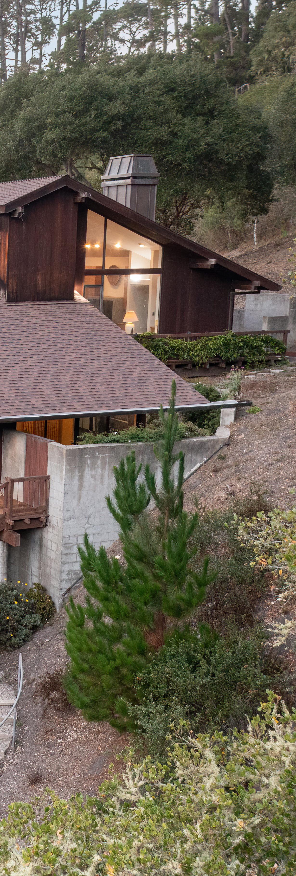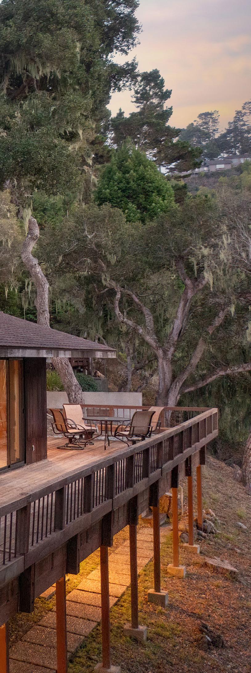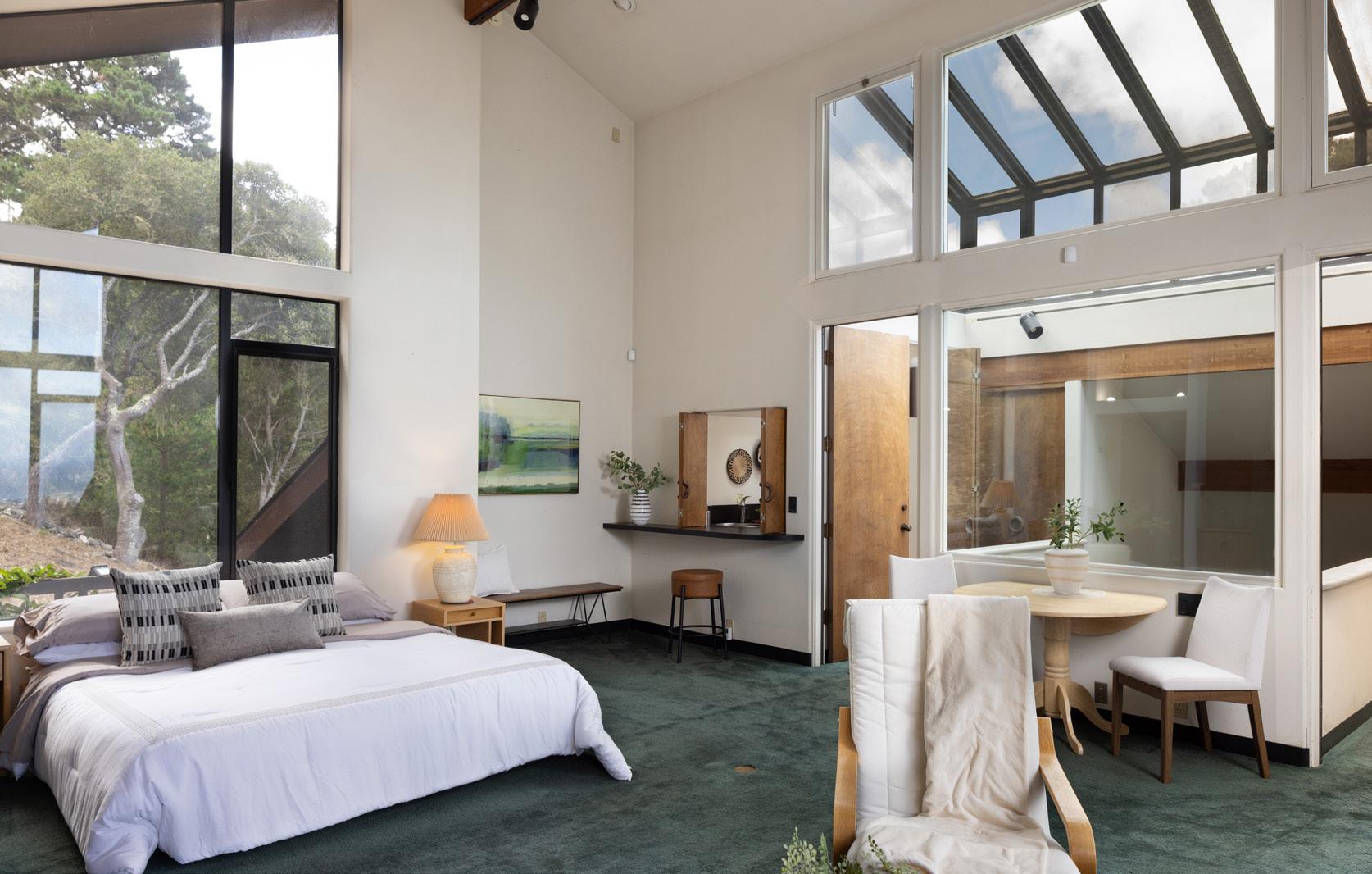 Designed by local acclaimed architect Olof Dahlstrand, this architectural gem blends timeless design with the tranquility of its five-acre Carmel setting. Crafted in redwood and teak, the 5,777± sq. ft. residence frames sweeping views of Monterey Bay and the surrounding forest through walls of glass and expansive decks. Inside, warm textures and fine materials define every space, including five sculptural concrete fireplaces and custom built-ins throughout. Perfect for entertaining, the home features multiple living areas, including a library and family room, and two full kitchens—one with a commercial-grade Vulcan range and dual Traulsen refrigerators. Four ensuite bedrooms each open to private patios, while the primary suite offers its own fireplace and kitchenette. Additional amenities include a sauna, two laundry rooms, an artist studio with water, and a detached four-car garage. Centrally located within a few minutes’ drive into downtown Carmel, Monterey, and all the incredible amenities the Peninsula has to offer, this rare architectural retreat is a place where design, nature, and light exist in perfect harmony.