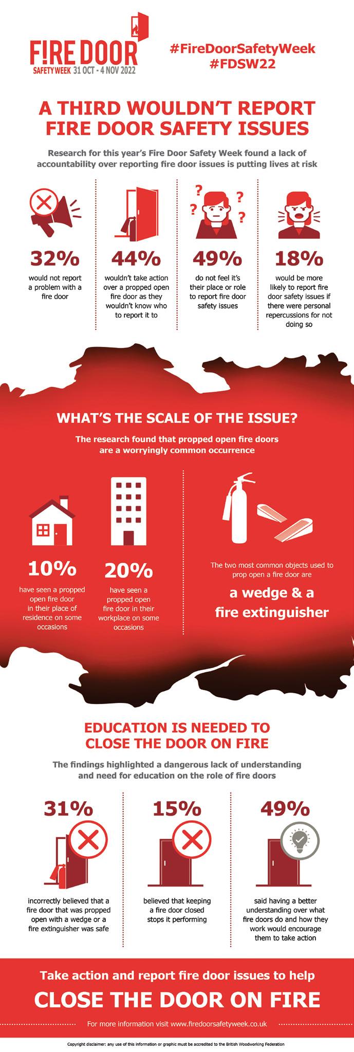 for education on the role of fire doors. The encouraging news is that when people are better informed about fire doors, they’re more likely to report issues. Half (49%) of respondents said having a better understanding over what fire doors do and how they work would encourage them to take action.”