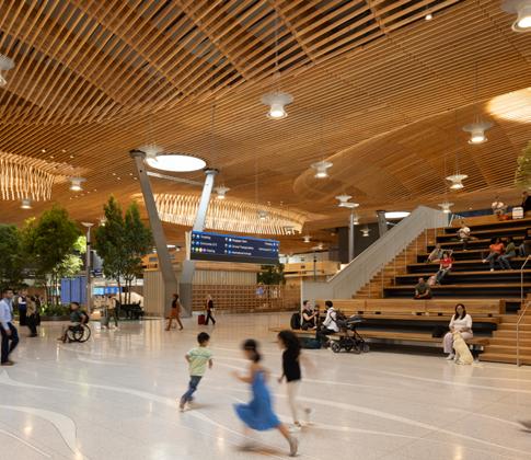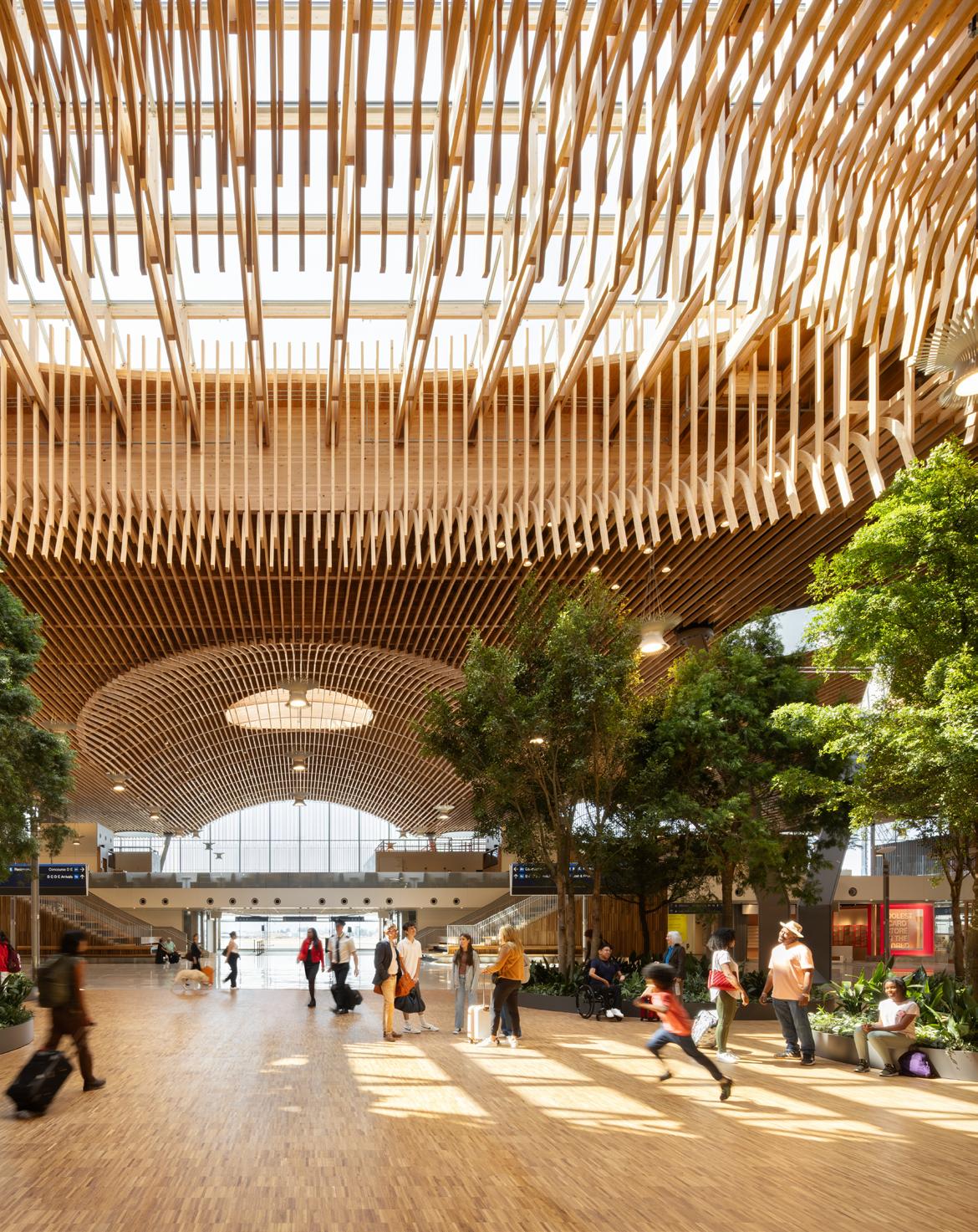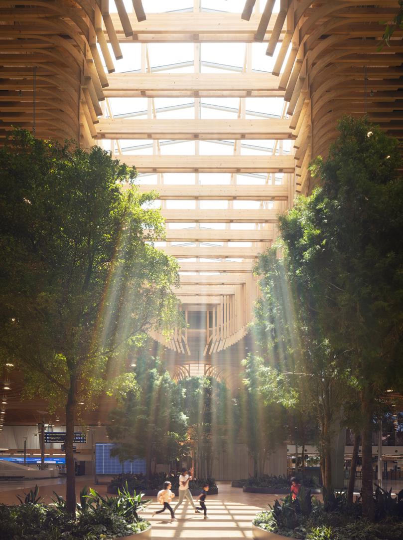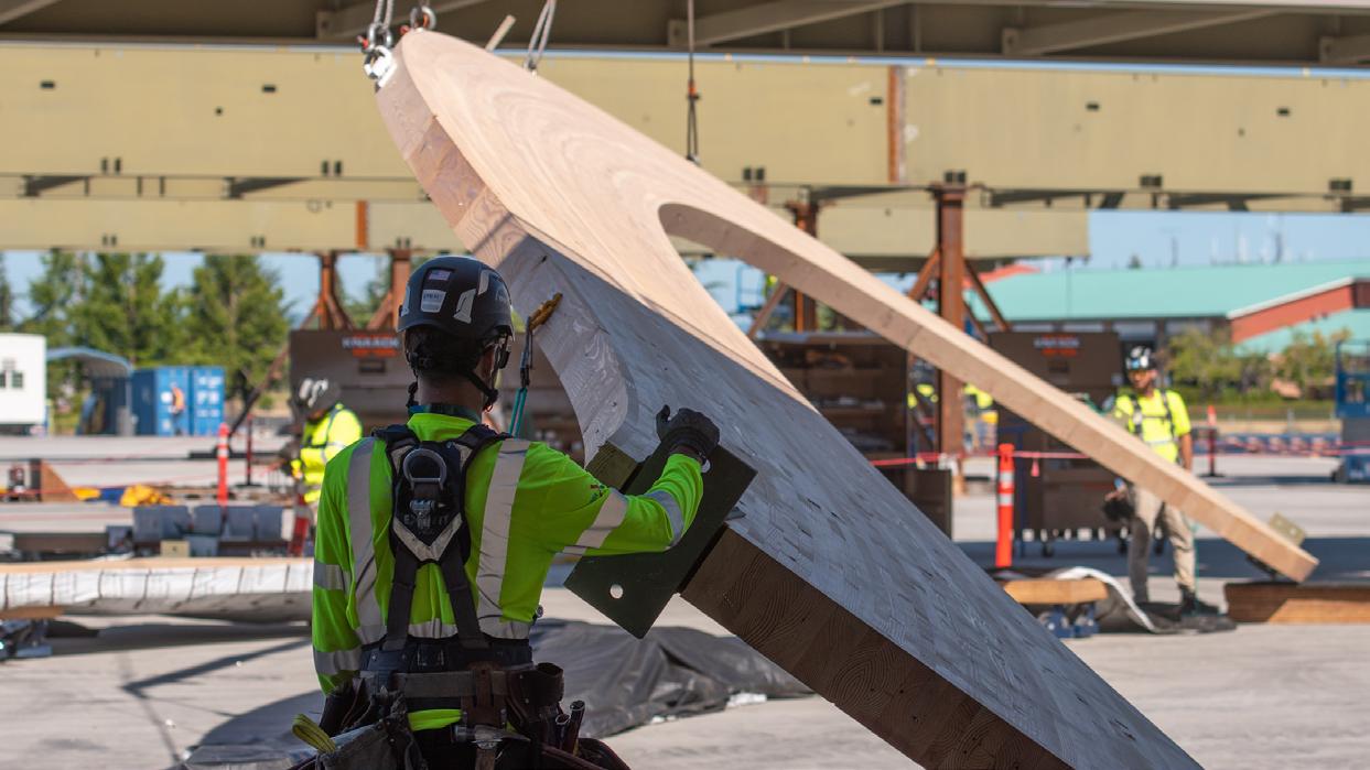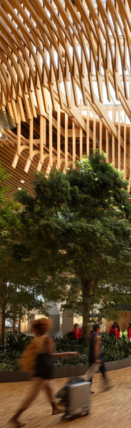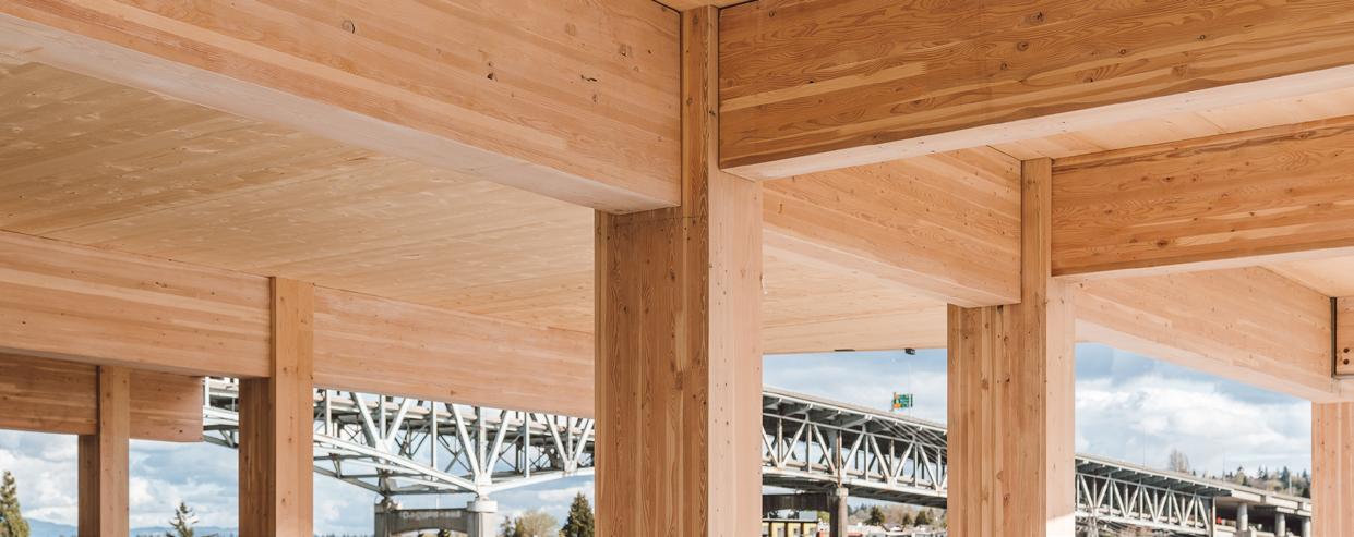 Portland International Airport’s Terminal Core Redevelopment is anchored by a nineacre, curved mass timber roof composed of 3.5 million board feet of Douglas fir, with long-span 80-foot glulam arches, a 2-inch mass plywood panel (MPP) diaphragm/ skylight curb system, and an underside 3x6 lattice layer consisting of over 30,000 pieces. Timberlab entered the project in 2019 in a design-assist role, providing constructability input, strategic procurement coordination with regional producers, and fabrication-level digital coordination to translate the roof’s compound geometry into buildable cassettes.