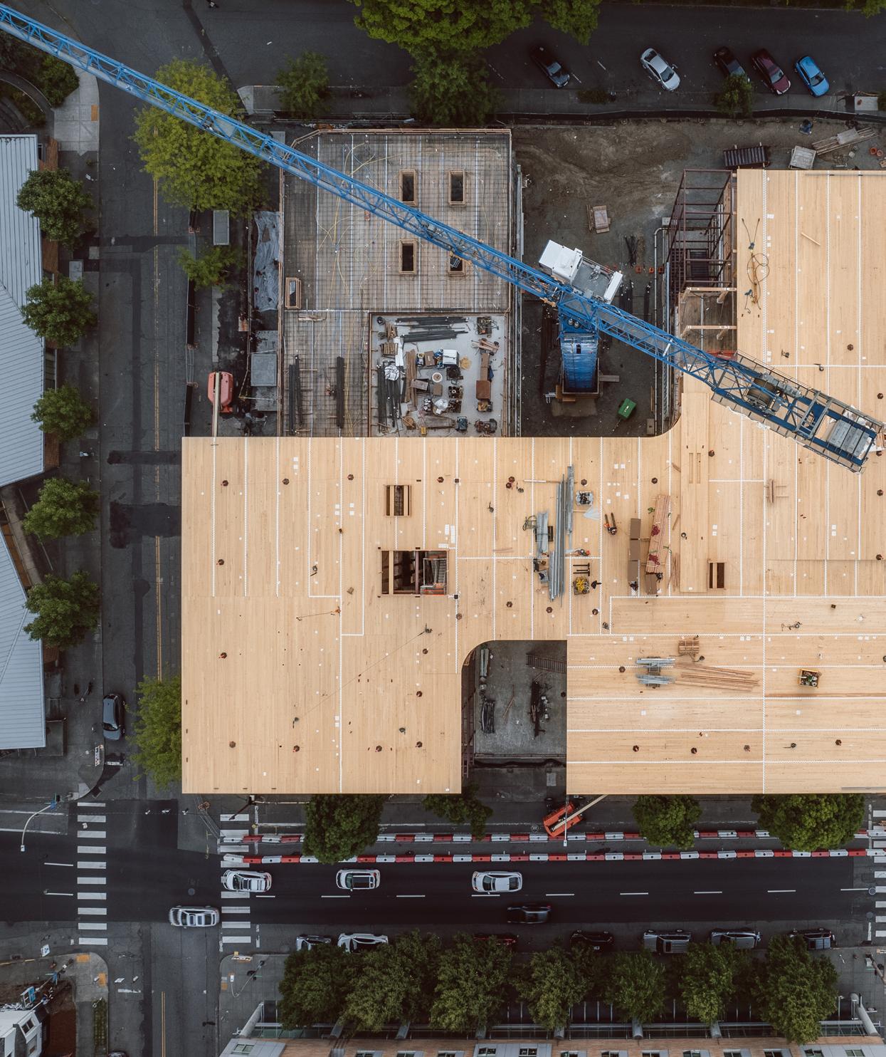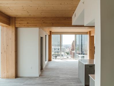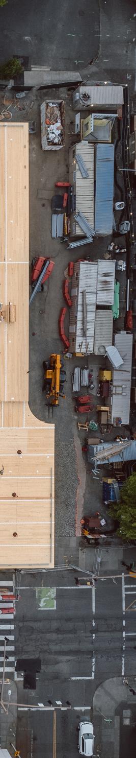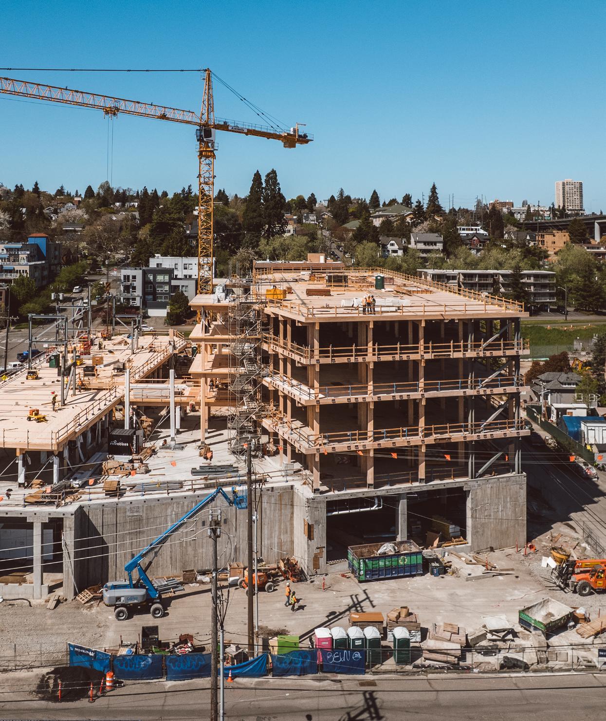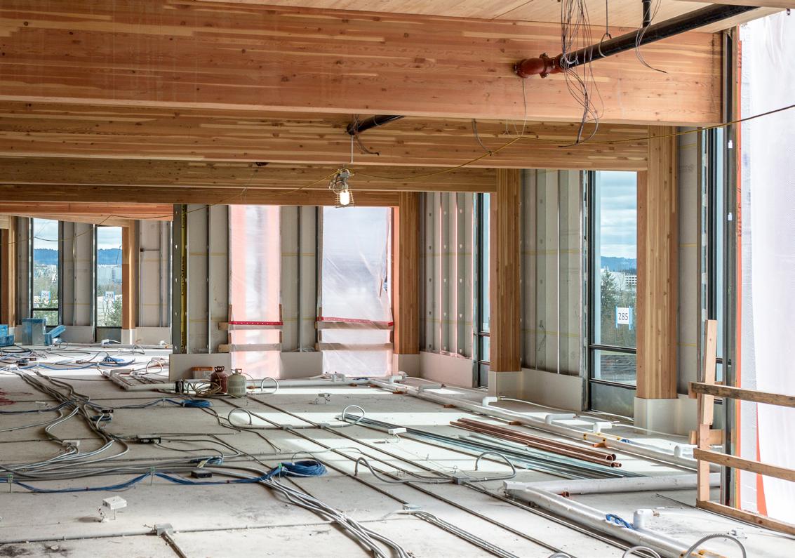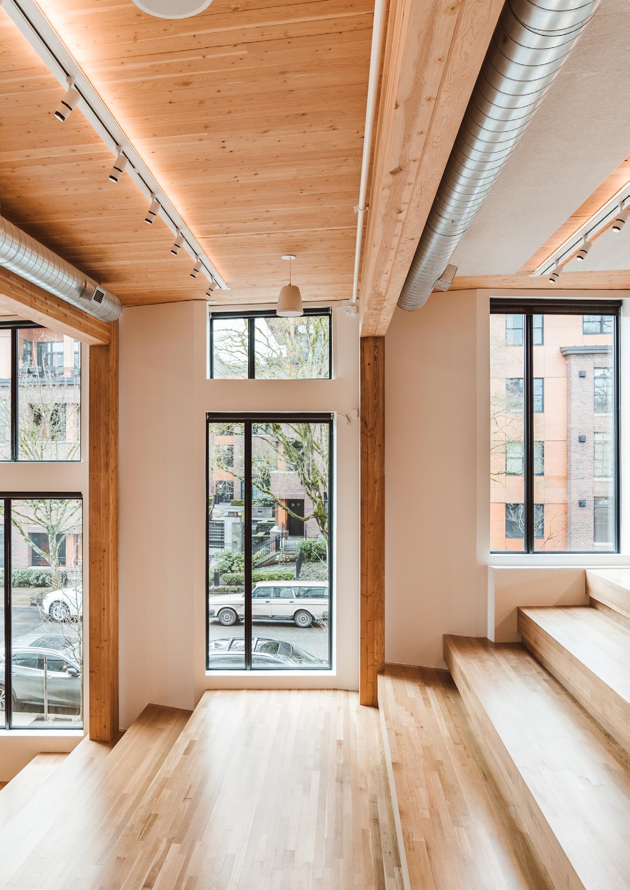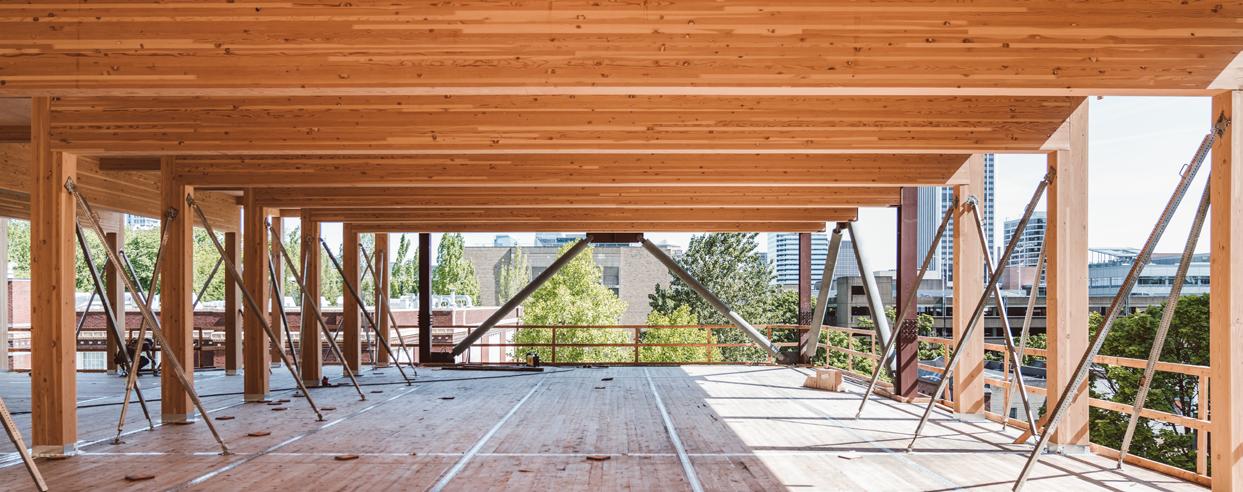Heartwood is the first building in the country permitted as Type IV-C construction in the United States. At eight stories and 70,000 gross square feet in the Capitol Hill neighborhood, it is the first tall wood building permitted by the City of Seattle. Timberlab, in partnership with DCI Engineers, developed a 2-hour fire-rated woodto-wood connection for the structure.