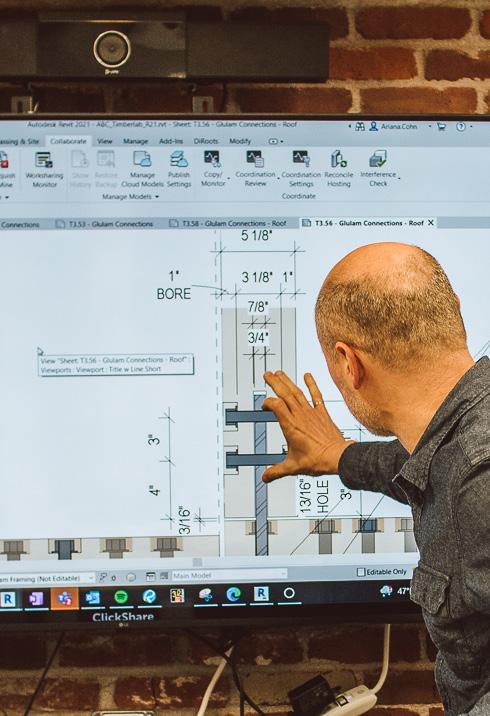 When engineering a complete timber frame, or a more limited scope of timber connections, our timber engineering team works directly with the design team and collaborates internally with our estimators, digital construction engineers, CNC operators, and superintendents to arrive at the best solution.