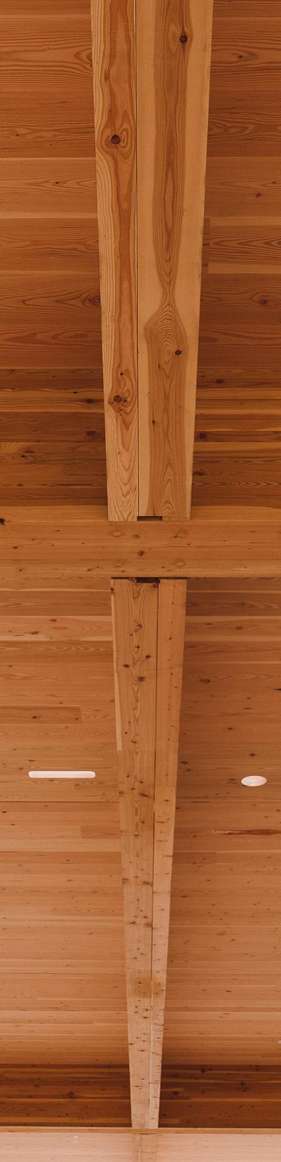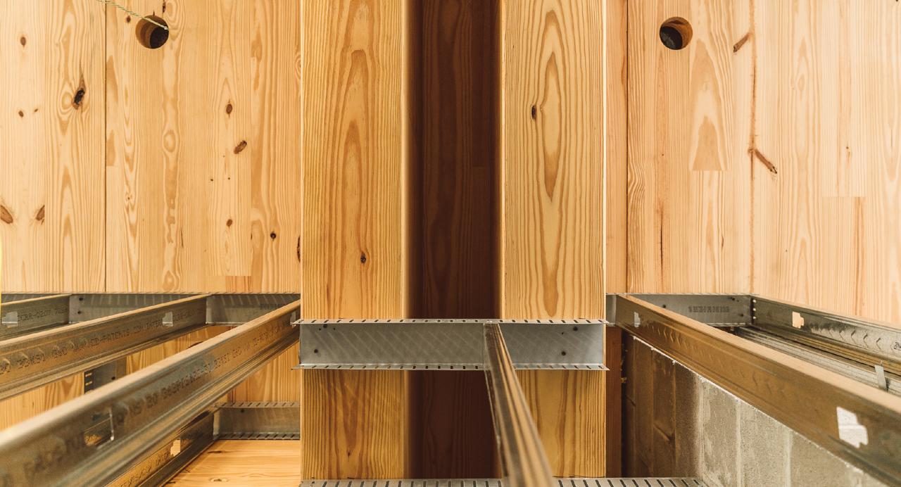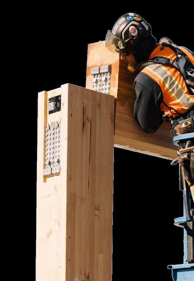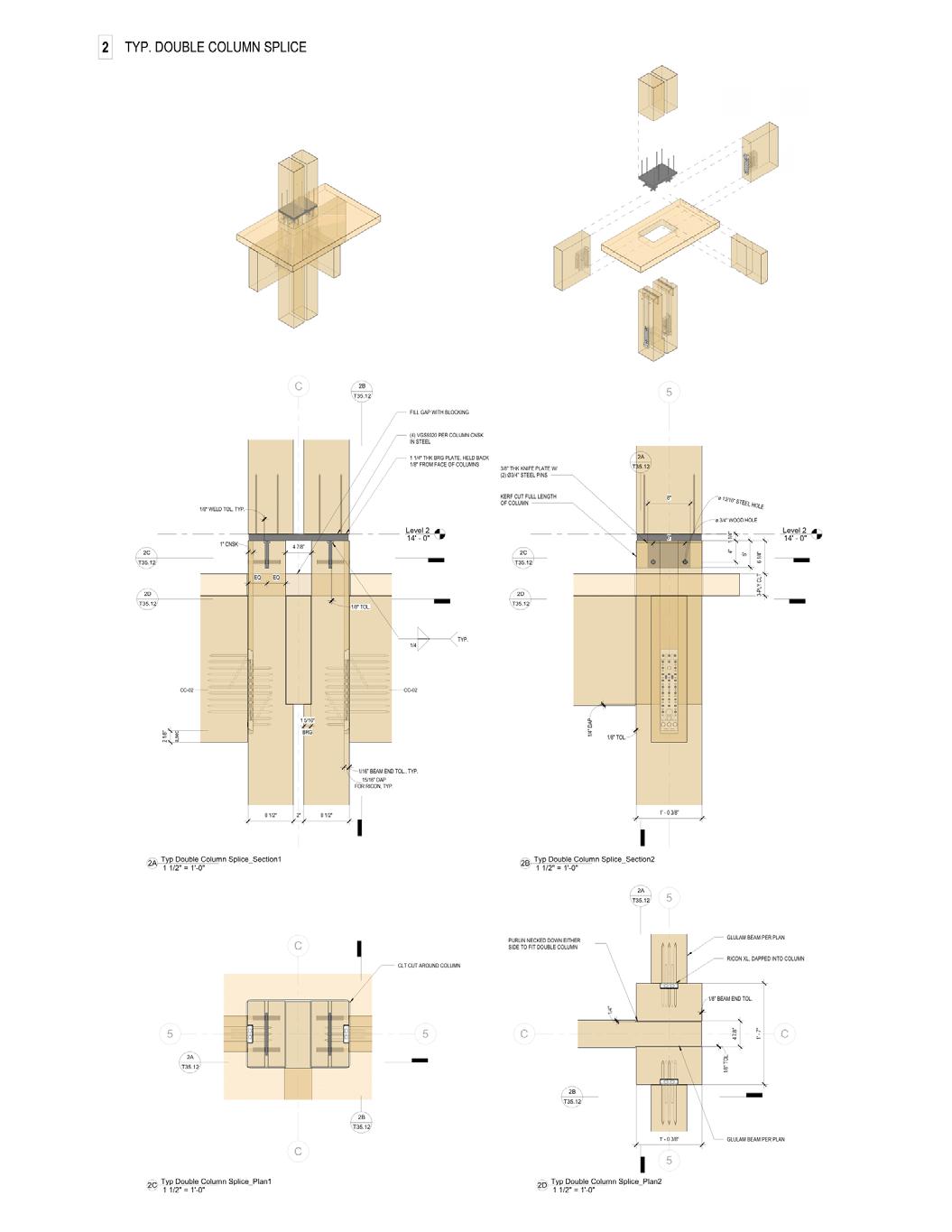 • The location of the column splice is shifted slightly to ensure sufficient access to the pins above the CLT.