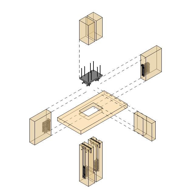 • The glued-in rod / knife plate column splice arrangement has been inverted, locating the pins within the architectural floor build-up and eliminating the need for plugs to conceal the pins.