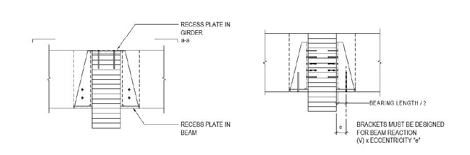 • The option with two separate brackets is provided. The “saddle” version of the detail would involve added cost for steel fabrication (complete joint penetration welds are typically required at the corners) and can present fit-up issues in the field due to the bracket warping out of square due to the heat of welding.