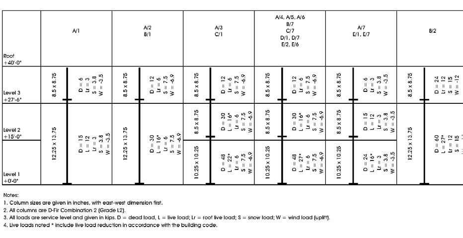 Unless multi-story columns are explicitly required, columns are typically spliced at each floor level. To allow for the design of the splices, provide column forces at each level. If the structural drawings include a column schedule, an annotated schedule is preferred, as shown in Figure 4. Alternatively, a typical column splice force at each level and/or unique column size can be given.