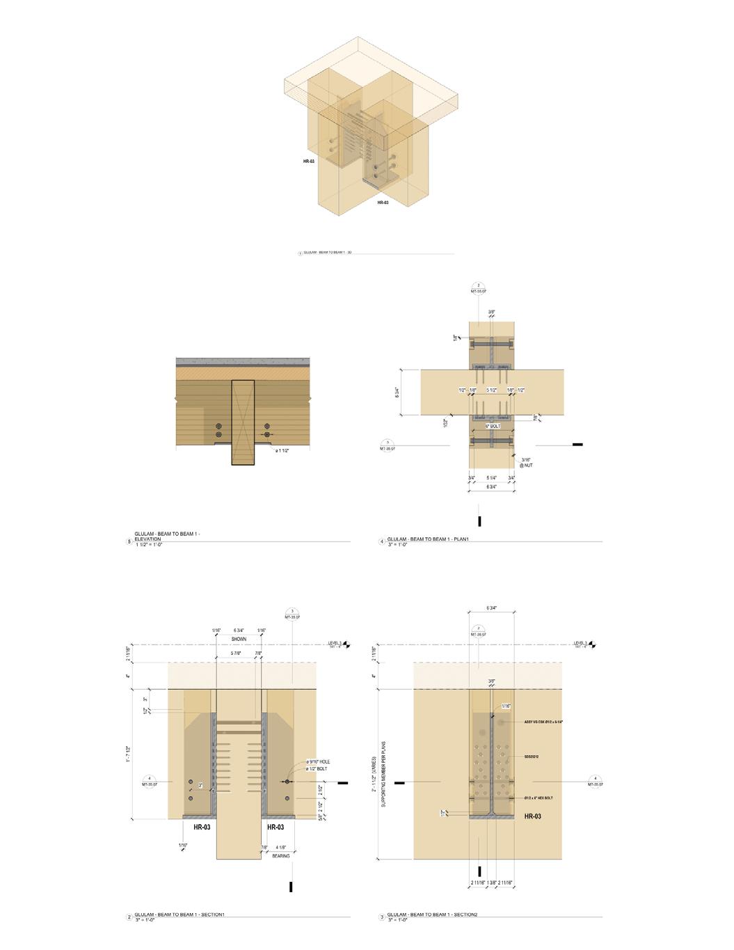 Following Design Criteria Lock, Timberlab’s delegated design efforts focus on developing typical connection details. These details are typically drafted in 2D format, though 3D views may be needed for connections with complex geometry that are difficult to visualize in 2D. The amount of time needed for this initial phase varies by project, but the minimum time allotted for smaller projects is three weeks. The details then go through an internal Timberlab review by our fabrication and installation teams to provide constructibility feedback, with a subsequent period to incorporate any changes prior to submitting the typical details to the design team. Once the design team’s feedback is received, we request a page-turn meeting to review the comments and come to agreement on any changes to the typical details.