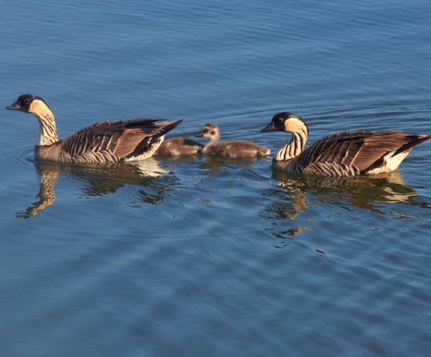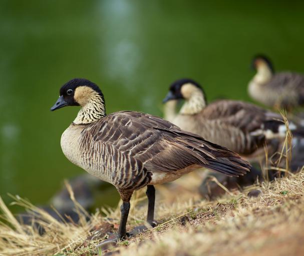 From October through March, the endangered Nēnē begin their nesting season. Hōkūala is home to many geese and established mating pairs that you may see during your visit. Once a suitable partner is found, Nēnē mate for life, returning year after year to the same nesting areas. Their lively honking and gentle head-bobbing displays are a delight to witness. Pairs typically return in large numbers beginning in October, with nesting peaking between November and January. Females lay two to five eggs in shallow, down-lined nests. The eggs hatch after about 30 days, during which the female remains dedicated to incubation, leaving briefly only to eat or drink. Before each short break, she carefully covers the eggs with down to keep them warm and hidden from predators. The male remains close, guarding his mate and their nest until the goslings hatch — after which the family ventures out to the ponds and grassy areas to forage together.