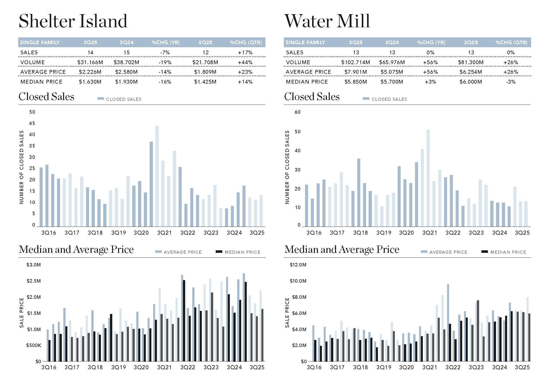 The luxury market is the top 10% of all home sales by price during the quarter. As various factors redefine the high-end market in any given period, price figures may exhibit more volatility than the market overall. However, because the luxury market is a fixed percentage of the overall market, its changes in the number of sales will always match the overall market. In Third Quarter 2025, South Fork luxury average price increased 12% to $12.245M. Median price increased 16% to $10.800M due to a larger share of sales over $20M and a smaller share below $8M. Third Quarter 2025’s most expensive reported sale was a Southampton Village oceanfront home on Meadow Lane for $32M. Southampton Village also had the second most expensive sale, a bayfront Meadow Lane estate that closed for $26M. Southampton Village and Bridgehampton were tied for the greatest number of South Fork luxury sales at nine each. The average luxury sale price for the North Fork increased 17% annually, and median price expanded 22% year-over-year. The increases were the result of a greater share of closings over $2.5M than a year ago. The highest-priced North Fork sale was a 5,500-square-foot home with 200 feet of beach access on Peconic Bay for $8M.Water