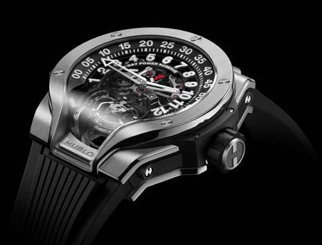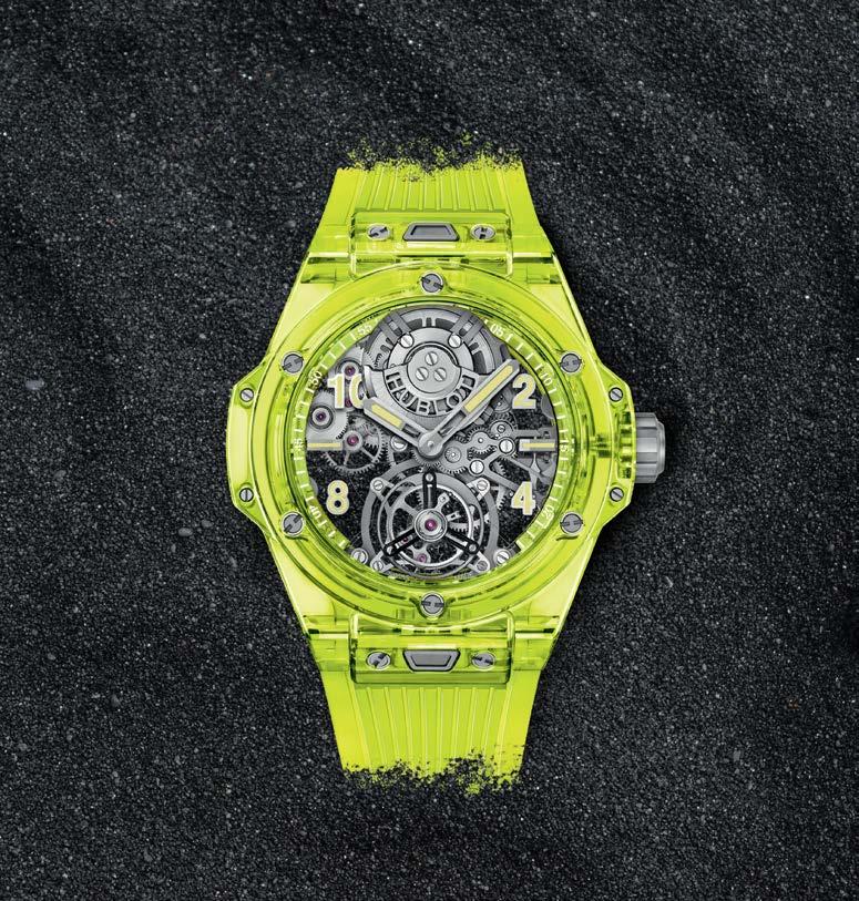 Dalam case 44 mm bermaterialkan SAXEM (Sapphire Aluminium oXide and rare Earth Mineral) berwarna kuning ultra cerah serupa neon dan skeleton dial yang menyingkap keindahan selfwinding tourbillon movement, Calibre HUB6035, yang menenagainya dengan rotor mikro, bridge bermaterialkan safir, serta cadangan daya hingga 72 jam. Jam ini dilengkapi oleh temali karet berwarna senada dengan sistem One Click.