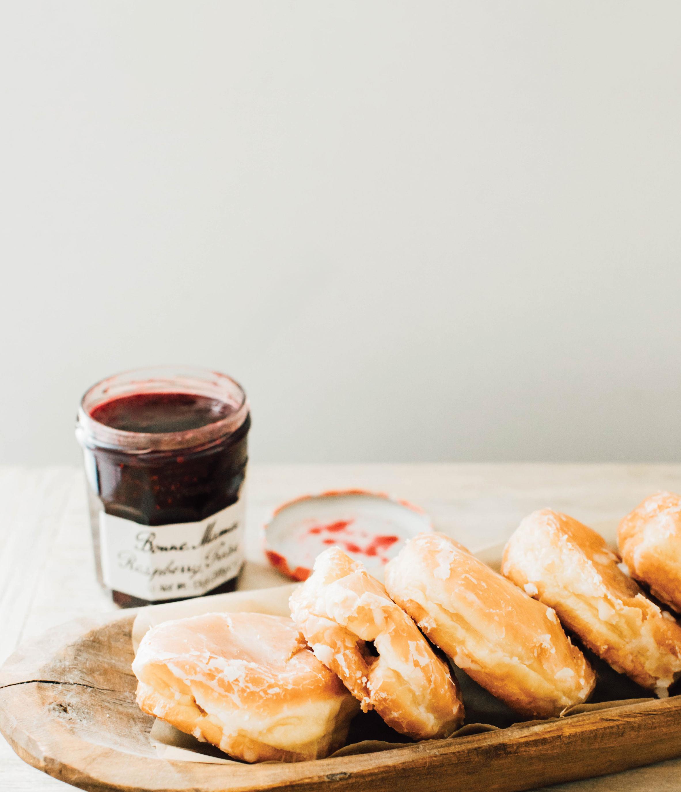 Heat 4 cups of oil in a deep fryer or large pot to 350F. Carefully slide doughnuts into hot oil using a wide spatula. Turn the doughnuts over as they rise to the surface. Doughnuts are ready when both sides are golden brown. Fill with 1 tablespoon jelly using a pastry injector, or by cutting a small slit in the side of the doughnut and inserting the jelly with a baby spoon. Close tightly; roll in confectioners’ sugar.
