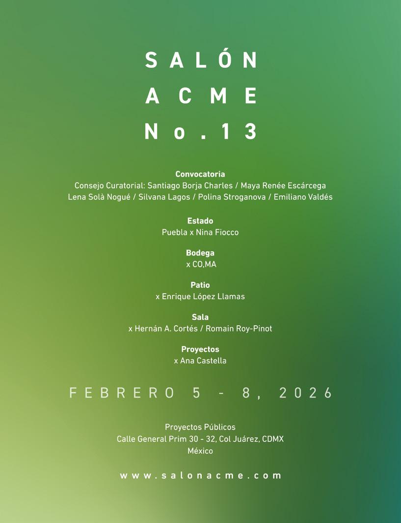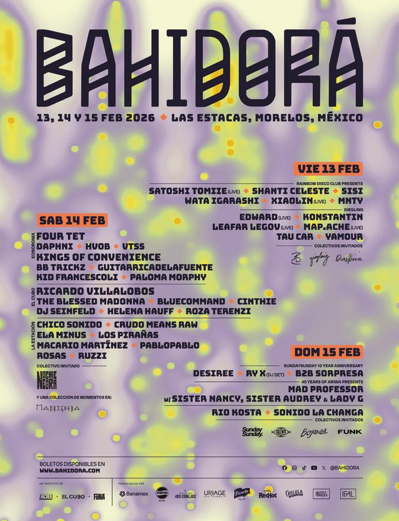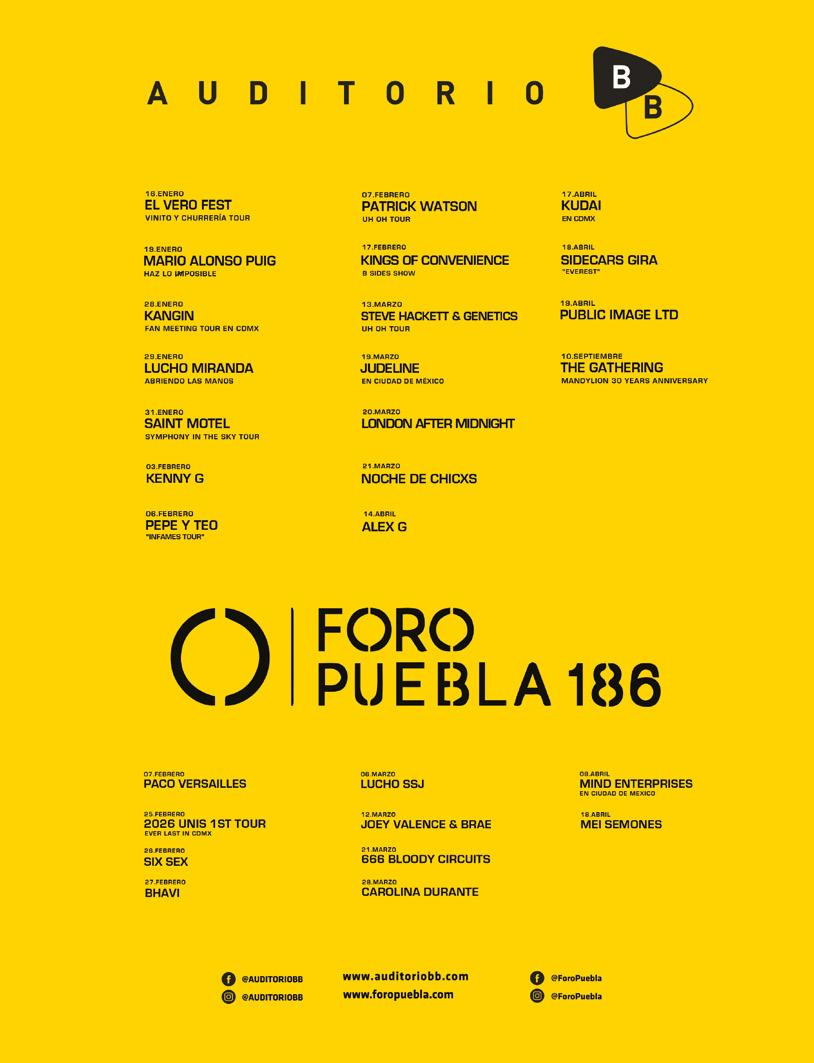 Time Out México Consejo Directivo Carlos H. Verástegui y Héctor Toledo Teja Editorial Director Editorial, City, Viajes, Libros y LGBT Mauricio Nava mauricio@timeoutmexico.mx Trends y News María Flores mariaflores@timeoutmexico.mx Restaurantes, Cafés & Vida Nocturna Elisa Herrera elisa@timeoutmexico.mx Shopping, Teens & Kids Mattza Tobón mattza@timeoutmexico.mx Cine, TV, Arte, Teatro Ángel Arroyo angel.arroyo@ timeoutmexico.mx Música Rodrigo Sánchez rodrigo.sanchez@timeoutmexico.mx Multimedia Aranza Aranza aranza@timeoutmexico.mx Redes sociales Griselda Gómez griselda@timeoutmexico.mx Colaboradores, Stivi de Tivi, Alexis Gutiérrez, Araceli Murillo, Hiram Ballesteros, Diego Álvarez, Aura Mendoza, Gaby Vázquez, Mariana Mijares, Ariadna Estrada, Gil Camargo, Anabel Oviedo, Yulissa Jacinto Arte Coordinador de Arte Victor Santacruz victor@timeoutmexico.mx Coordinadora de Fotografía Alejandra Carbajal Producción & Operación Coordinador de Logística Erick Mondragón Publicidad Alejandro Aguirre alex@timeoutmexico.mx, Patricia Quijano patricia@timeoutmexico.mx Relaciones Públicas Marketing & Ventas Julio Chávez julio@timeoutmexico.mx Suscripciones & Distribución suscripciones@timeoutmexico.mx Administración & Finanzas Recursos Humanos & Coordinación Administrativa Melissa Valverde Digital Campaign Manager Arturo León Betanzos Legal All Entertainment Abogados Time Out Internacional Founder Tony Elliott Executive Chairman Julio Bruno Chief Executive Officer Noel Penzer Executive Vice President International David Woodley Art Director Brand Anthony Huggins International Digital Content Editor Alex Plim Time Out México, Año 13, No. 167, Febrero 2026, es una publicación mensual editada y publicada por Museo Citadino, S.A. de C.V., Mariano Escobedo 498, Piso 10, Colonia Anzures, C.P. 11590, México, Ciudad de México. Tel. 5562650367. Editor Responsable: Carlos Alberto Miguel Hernández Verástegui. Reserva de Derechos al Uso Exclusivo del Título No. 04-2013-052413212700-102, ISSN 2007-4182. Certificado de Licitud de Título y Contenido No. 15547. Impresa por E-MKM Herramientas de Comercialización, Isabel la Católica 421, Col. Obrera CDMX C.P 06800, 55 8998 9344. Distribuida por Erick Rangel Mondragón (Destinatario & Target) Calle 18 #76, Colonia Olivar del Conde 1ra. Secc., Álvaro Obregón, CP 01400, Ciudad de México, México. Este número se terminó de imprimir el 22 de enero de 2026 con un tiraje de 35,000 ejemplares. Las opiniones expresadas por los autores no necesariamente reflejan la postura del editor de la publicación. Esta casa editorial se deslinda de los mensajes expresados en los espacios publicitarios. Los anuncios no reflejan la línea editorial de Time Out México. Queda a criterio de nuestros lectores su interpretación. Queda estrictamente prohibida la reproducción total o parcial de los contenidos e imágenes de