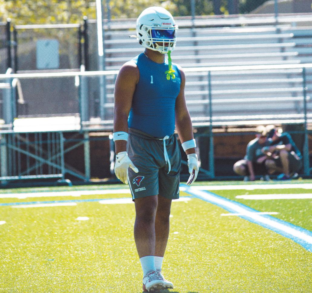 Senior Alex Marzan (#1) stands ready on defense during a summer scrimmage. The versatile senior dropped 20 pounds this offseason and will play both linebacker and running back.