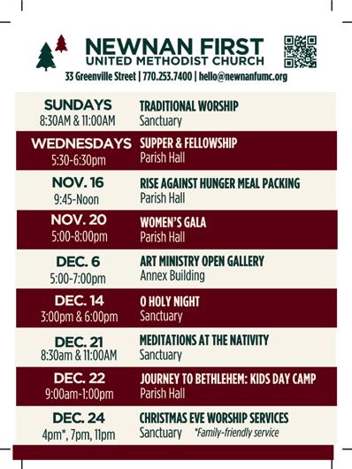 Along with organizations that supply tangible items and services during the holidays, many more provide experiences Cowetans have come to consider as family traditions. For many, the holidays are not complete without watching Newnan Theatre Company’s annual Christmas play or visiting the live Nativity at CORRAL’s barn in Roscoe. For these and other annual holiday events, see page 46.
