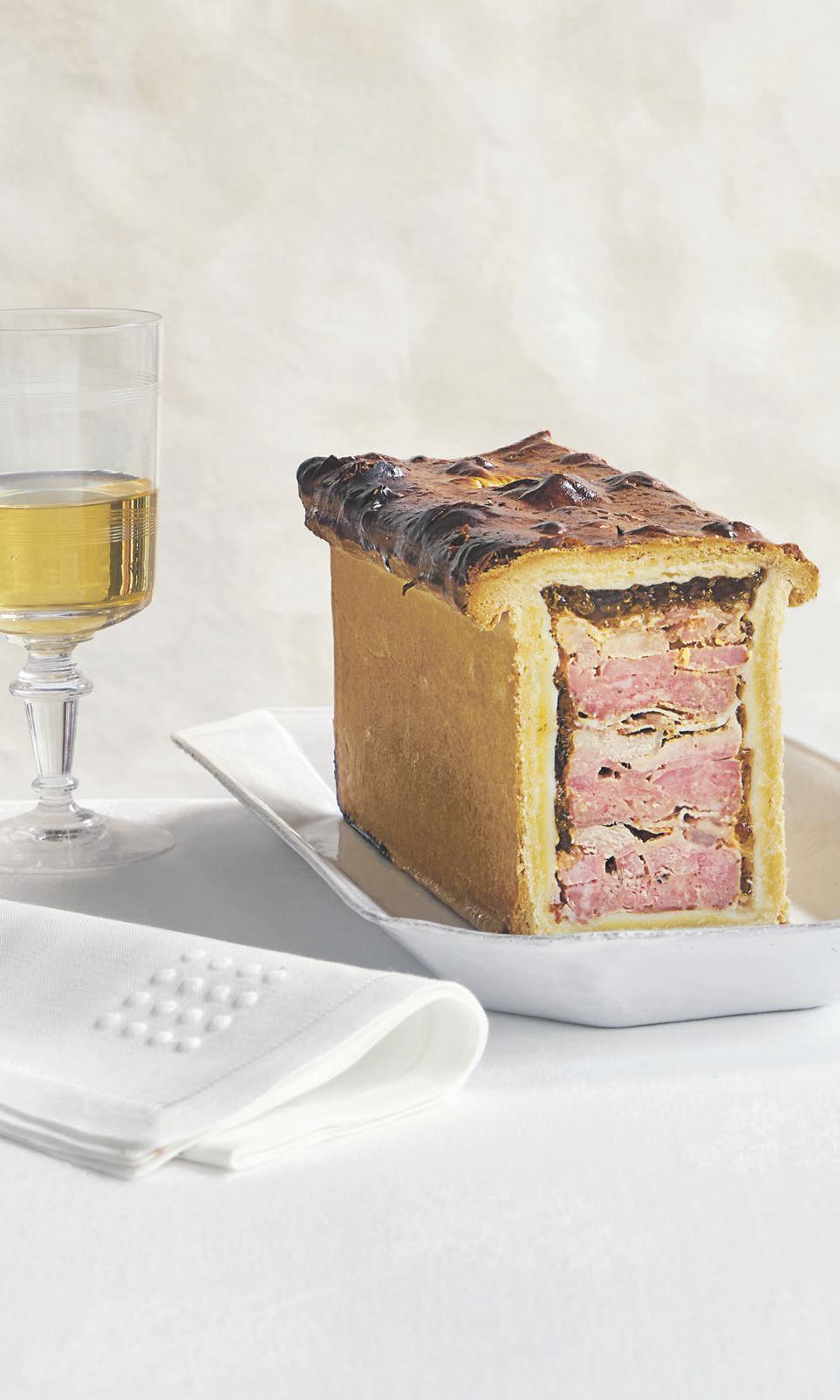 To assemble the filling, place a layer of bacon slices (rashers) at the bottom, then a layer of stu ng, a little of the ham, then a layer of the veal, seasoning each layer well with pepper. Continue making layers until