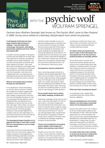 German-born Wolfram Sprengel, best known as The Psychic Wolf, came to New Zealand in 1989. He has since settled on a Bombay lifestyle block from where he practises. In astrological circles there are many types of psychic gifts and types of readings – tarot and angel cards, numerology, clairvoyance, channelling, psychometry, palmistry and more. What is your psychic gift? A medium connects people on this planet to those that have passed to the other side. That would be me. Psychics use different tools/gifts such as those mentioned. I use my vision and see spirits or situations and issues related to the client. I have used tarot cards in the past but, once again, they are a visual tool. I have pretty much always had the ability to see things and initially took this for granted. It was only when I realised that what I was dreaming and seeing (clairvoyance) was becoming more and more accurate that I took it seriously. What do most people hope to achieve through your clairvoyance? In my experience, closure and getting on with life. When someone in a family dies suddenly it can leave a gaping hole for years to come. That’s when I try to help. Imagine coming home to find your two-year-old daughter has been run over or your partner has died while you were shopping? When we experience such devastation it’s hard to see how we will ever cope again. That’s where I can step in and open communication with the loved one who has left. That final goodbye, finding out what actually happened, or a simple ‘I love you’ has a big impact. To know that loved ones on the other side are okay brings great comfort to people. The stereotypical image of psychics is of a gypsy fortune teller in a tent with a crystal ball. How representative is such an image in today’s world? I don’t know if this is accurate anymore. I, myself, have not come across a gypsy. The image of a psychic has changed due to modern technology especially computers and the internet. I can do readings with anyone around the world. Skype and 12 — Rural Living — March 2017