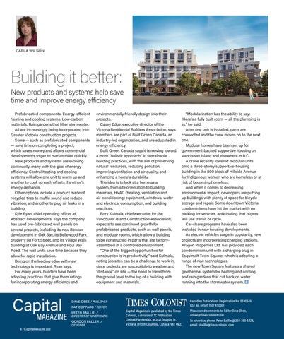 environmentally friendly design into their projects. Casey Edge, executive director of the Victoria Residential Builders Association, says members are part of Built Green Canada, an industry-led organization, and are educated in energy efficiency. Built Green Canada says it is moving toward a more “holistic approach” to sustainable building practices, with the aim of preserving natural resources, reducing pollution, improving ventilation and air quality, and enhancing a home’s durability. The idea is to look at a home as a system, from site orientation to building materials, HVAC (heating, ventilation and air-conditioning) equipment, windows, water and electrical consumption, and building practices. Rory Kulmala, chief executive for the Vancouver Island Construction Association, expects to see continued growth for prefabricated products, such as wall panels, and modular rooms, which allow a building to be constructed in parts that are factoryassembled in a controlled environment. “One of the biggest opportunities for construction is in productivity,” said Kulmala, noting job sites can be a challenge to work in, since projects are susceptible to weather and “distance” on site — the need to travel from the ground level to the top of a building with equipment and materials.