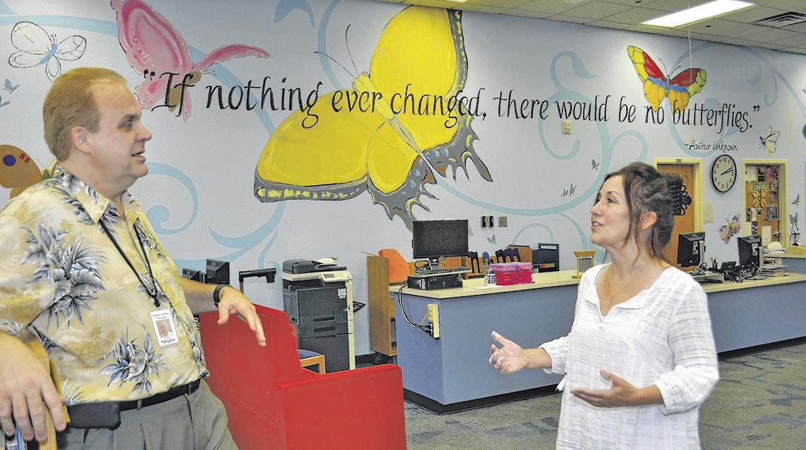 Suzanne Whitaker, who has painted murals at several Kyrene school, including this one at Kyrene de la Mariposa, where she is talking with Principal Spencer Falgatter, is working with a Mountain Pointe teacher and a Corona del Sol student to use art as a way curbing teen suicides.
