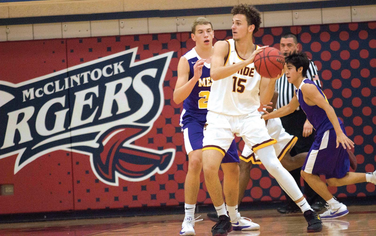 Jonah LaBranche tries to protect the ball during Mountain Pointe’s game with Mesa High in the McClintock Shooutout.
