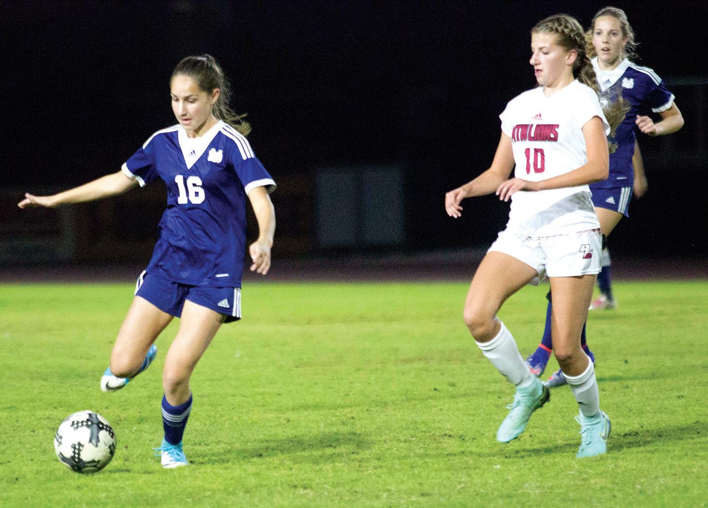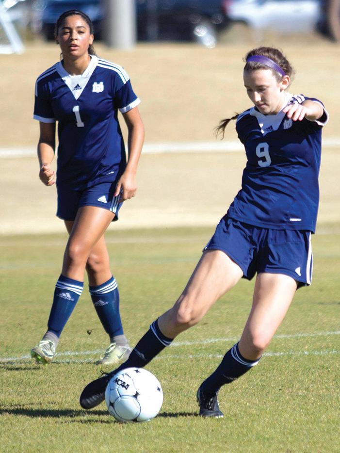 Nicole Nedza lines up a kick as Lauren Loughran looks on.