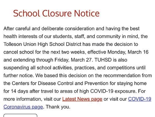 ation and having the best health interests of our students, staff, and community in mind, the Tolleson Union High School District has made the decision to cancel school for the next two weeks, effective Monday, March 16, and extending through Friday, March 27,” TUHSD Superintendent Nora Gutierrez said, in a letter to families.
