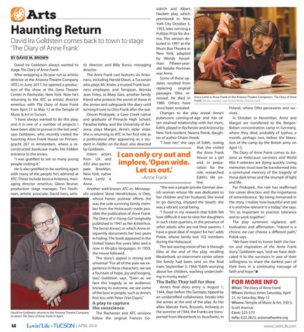 odrich and Albert Hackett play, which premiered in New York City October 5, 1955, later winning a Pulitzer Prize for drama. This version debuted in 1997 at the Music Box Theatre in New York, adapted by Wendy Kesseltic director; and Billy Russo, managing man. Fifteen-yearold Natalie Portman director. The Anne Frank cast features six Arizo- was Anne. Some of these upnans, including Harold Dixon, a Tucsonan dates resulted from who plays Mr. Kraler, a trusted Frank busireplacing original ness employee, and Tempean, Brenda passages Otto reJean Foley, as Miep Gies, another family moved. He died in Anna Lentz is Anne Frank in the Arizona Theatre Company’s The Diary of Anne friend who protects the secret of those in Frank. (Photos courtesy Goat Factory Media Entertainment) the annex and safeguards the diary until 1980. Others have Poland, where Otto perseveres and surturning it over to Otto Frank after the war. since been revealed. Changes to the play reveal Anne’s vives. Devon Prokopek, a Cave Creek native pubescent coming-of-age and her ofIn October or November, Anne and and graduate of Pinnacle High School, ten strained relationship with her mom, Margot are transferred to the BergenParadise Valley, and the University of AriEdith, played in Rochester and Arizona by Belsen concentration camp in Germany, zona, plays Margot, Anne’s elder sister. New York resident, Naama Potok, daughwhere they died, probably of typhus, a She is returning to ATC in her first role as ter of author Chaim Potok. month, perhaps two, before the liberaa professional after appearing as a stu“I love her, ” she says of Edith, noting tion of the camp by the British army on dent in Fiddler on the Roof, also directed that she visited April 15. by Goldstein. the Anne Frank The Diary of Anne Frank comes to AriIntern actors House as a girl zona as Holocaust survivors and World from UA and and, in prepaWar II veterans are dying quickly. Living ASU also particiration for the memories must now be transformed into pate. Brooklyn, role, researched a communal memory of the tragedy of New York, native Edith’s life onthose dark times and the triumph of light –Anne Frank Anna Lentz is line. and life. Anne. “She was a proper private German JewFor Prokopek, the role has reaffirmed Another well-known ATC-er, Minneapolis resident Steve Hendrickson, is Otto, ish woman whose life was dedicated to her career direction and the importance whose heroic postwar efforts (he her children and her husband. She loved of remembrance: “By being immersed in was the sole surviving family mem- to go dancing, enjoyed the beach; she the story, I realize how beautiful and sad it is and how relevant it is today,” she says. ber from the Holocaust) made pos- was a vibrant social being. “I found in my research that Edith felt “It’s so important to practice tolerance sible the publication of Anne Frank: how difficult it was to raise her daughters and to work together.” The Diary of a Young Girl (originally in such close quarters, in the presence of The play summons vigilance, selfpublished in 1947 as Het Achterhuis, other adults who are not their parents. I evaluation and affirmation. “Hatred is a The Secret Annex), in which Anne eloquently documents her two years have a great deal of respect for her,” adds choice; we can choose a different path,” in hiding. The book appeared in the Potok, whose family lost 102 members Potok says. “We have tried to honor both the horUnited States five years later and is during the Holocaust. The last searing vision of her is through ror and inspiration of the Anne Frank now in 60-plus languages. In 1959, Otto at the end of the play, recalling story, ” Goldstein says, “and we have dedithe movie followed. Westerbork, an internment center where cated it to the survivors in awe of their The story’s appeal is strong and the family had been sent on the final willingness to share the darkest part of universal: “For all of the pain we extrain, September 3, 1944: “Edith worrying their lives in a continuing message of perience in these characters, we see a fountain of hope, joy and longing, about her children, washing undercloth- faith and hope.” too,” Goldstein says. “Even as we ing in murky water.”