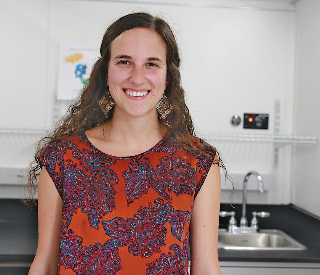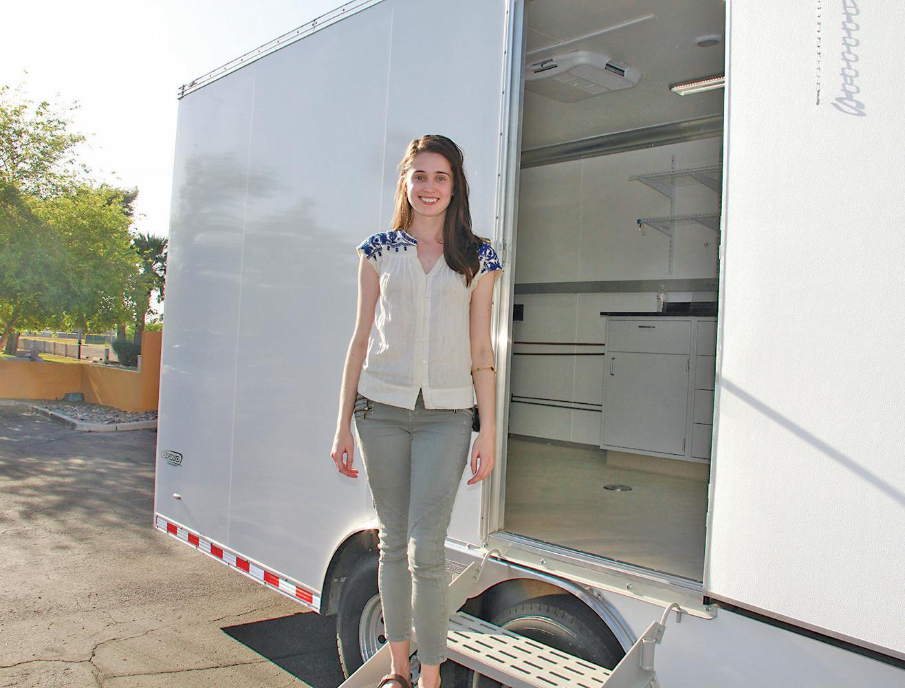 ASU student Fionnuala McPeake, one of Mantlik’s partners in the campaign to build a mobile dental unit, stands outside the vehicle, which still needs some equipment and exterior signage before it can be put to use.