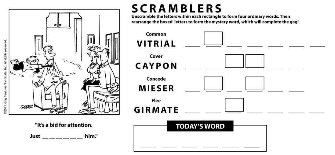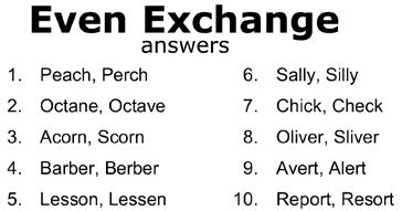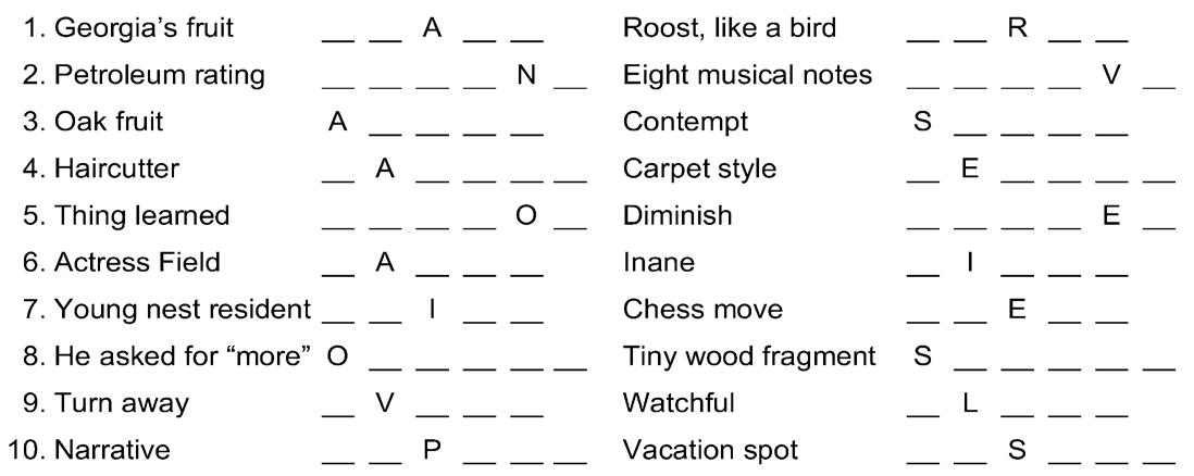 Each numbered row contains two clues and two answers. The two answers differ from each other by only one letter, which has already been inserted. For example, if you exchange the A from MASTER for an I, you get MISTER. Do not change the order of the letters.