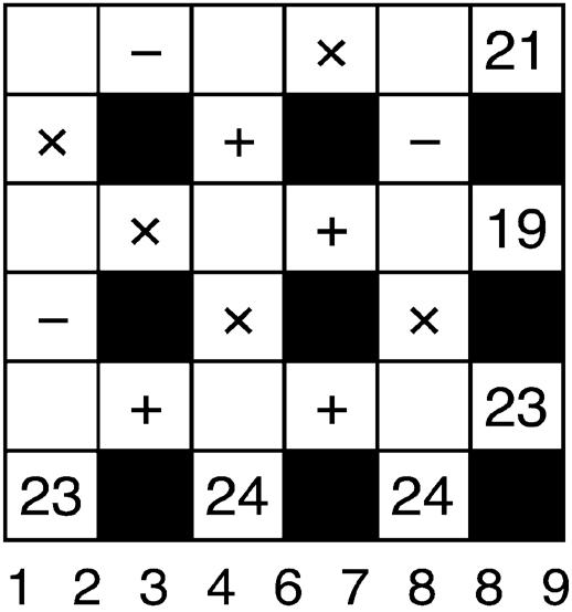 The idea of Go Figure is to arrive at the figures given at the bottom and right-hand columns of the diagram by following the arithmetic signs in the order they are given (that is, from left to right and top to bottom). Use only the numbers below the diagram to complete its blank squares and use each of the nine numbers only once.